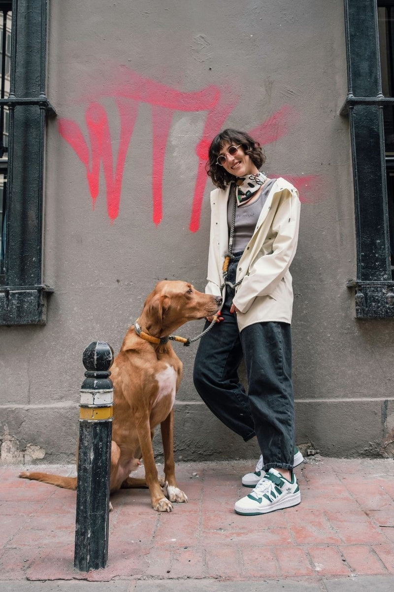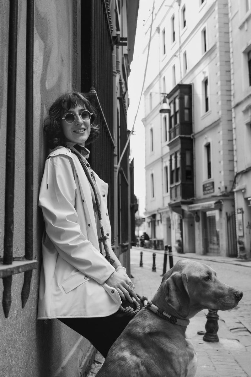 Bir şeyler üretmeyi, ellerimle yaratmayı ve yapmayı hep çok sevmişimdir. İlk tasmamı 2019 yazında, kendi ellerimle Bono için yaptım. O zamanlar deri tasma kullanıyorduk ve bu ürkek ama aşırı heyecanlı, biraz da ata benzeyen, uzun bacaklı oğlanı zapt etmeye çalışırken ellerim acıyordu. Önce deri tasma ellerimi yakmasın diye ortasına bir düğüm attım, baktım o da yetmedi, koton yumuşak halat alternatifler aramaya başladım ama Türkiye’de bulamadım. Koton halat buldum ama! Bildiğim birkaç gemici düğümünü de işin için katınca, ilk el yapımı tasmam hazırdı. Bono’ya ilk tasmasını yapmamla bunun bir ürüne ve markaya dönüşmesi arasında uzun bir yolculuk var. O ilk yaptığım gri-siyah tasma hala duruyor! Tabii bugünkü Nodo tasmalardan çok daha farklı gözüküyor, ama genel fikri ve varoluş amacı o zamankinden fazla farklı değil…