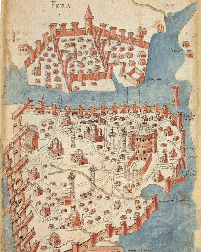 Floransalı din adamı ve seyyah Christoforo Buondelmonte 1422’de gördüğü yerleri el çizimiyle anlatmış, Galata-Pera’yı da gravürde yerleşim olan Galata Kulesi’ne kadar resmetmiştir.