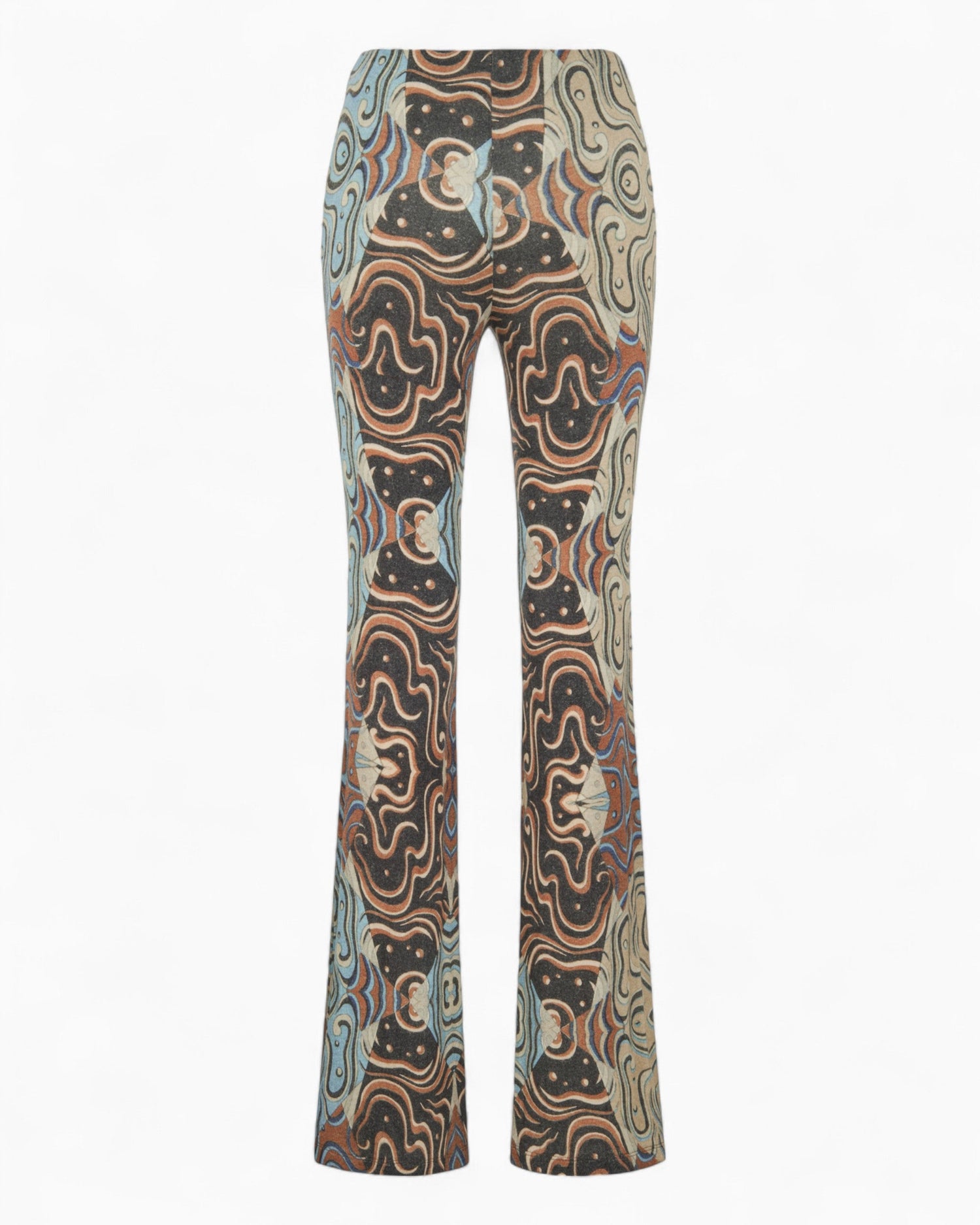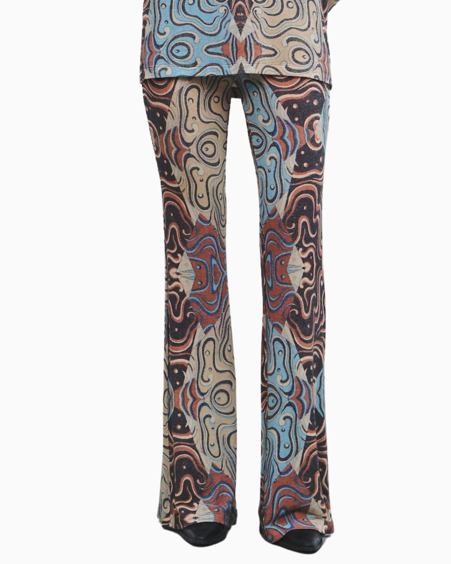 Featuring a fitted flare cut that hugs the waist and gently widens at the hem, these straight-leg pants are designed to flatter the silhouette while offering freedom of movement. The psychedelic print adds a bold, expressive touch—even to the simplest outfits.