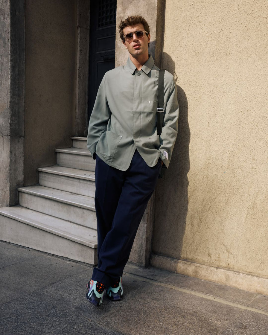 Études Studio Dressed Up Worker ceket, çağdaş iş giyimi estetiğini gündelik hayata taşıyor. Norse Projects Benn pantolon, yün ve pamuk karışımı dokusuyla rahat bir zarafet sunarken; Puma Inhale sneaker bu görünümün sportif enerjisini güçlendiriyor.