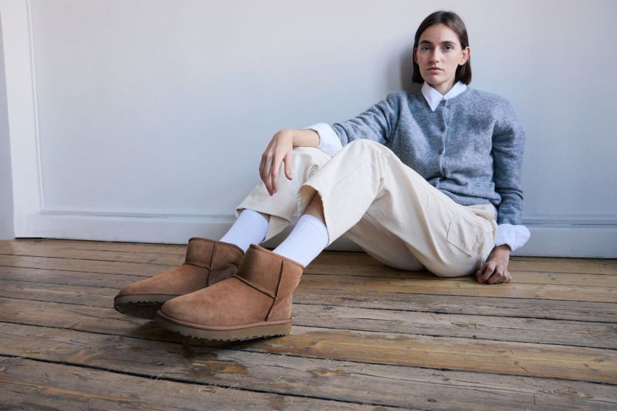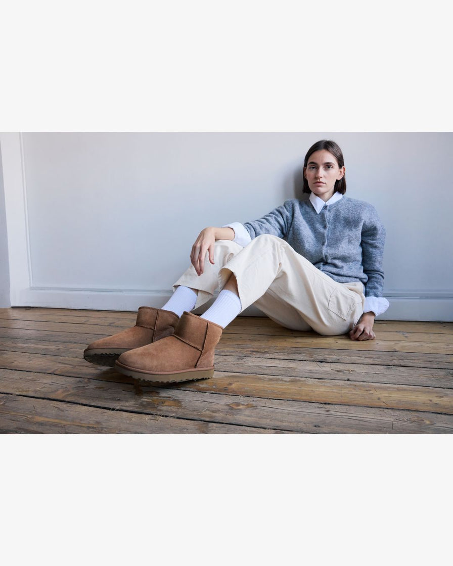 Soulland Rado gömlek, modern formu ve grafik detaylarıyla dikkat çekerken; Samsøe Samsøe Nor Short hırka, yumuşak dokusuyla sıcak bir katman yaratıyor. Carhartt WIP Drewe pantolonun rahat kalıbı ve UGG Classic Mini II botun ikonik konforu ise bu görünümü tamamlıyor.