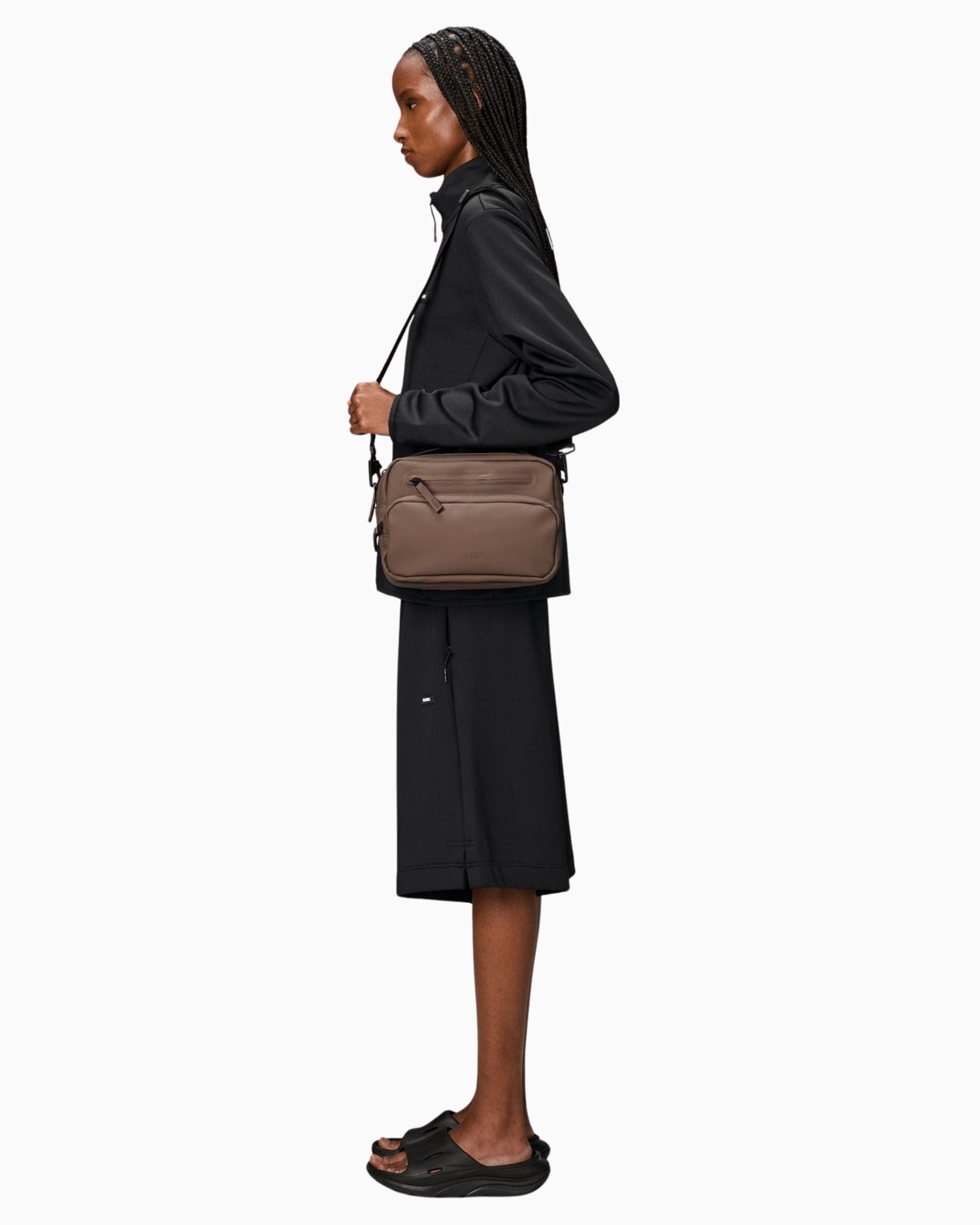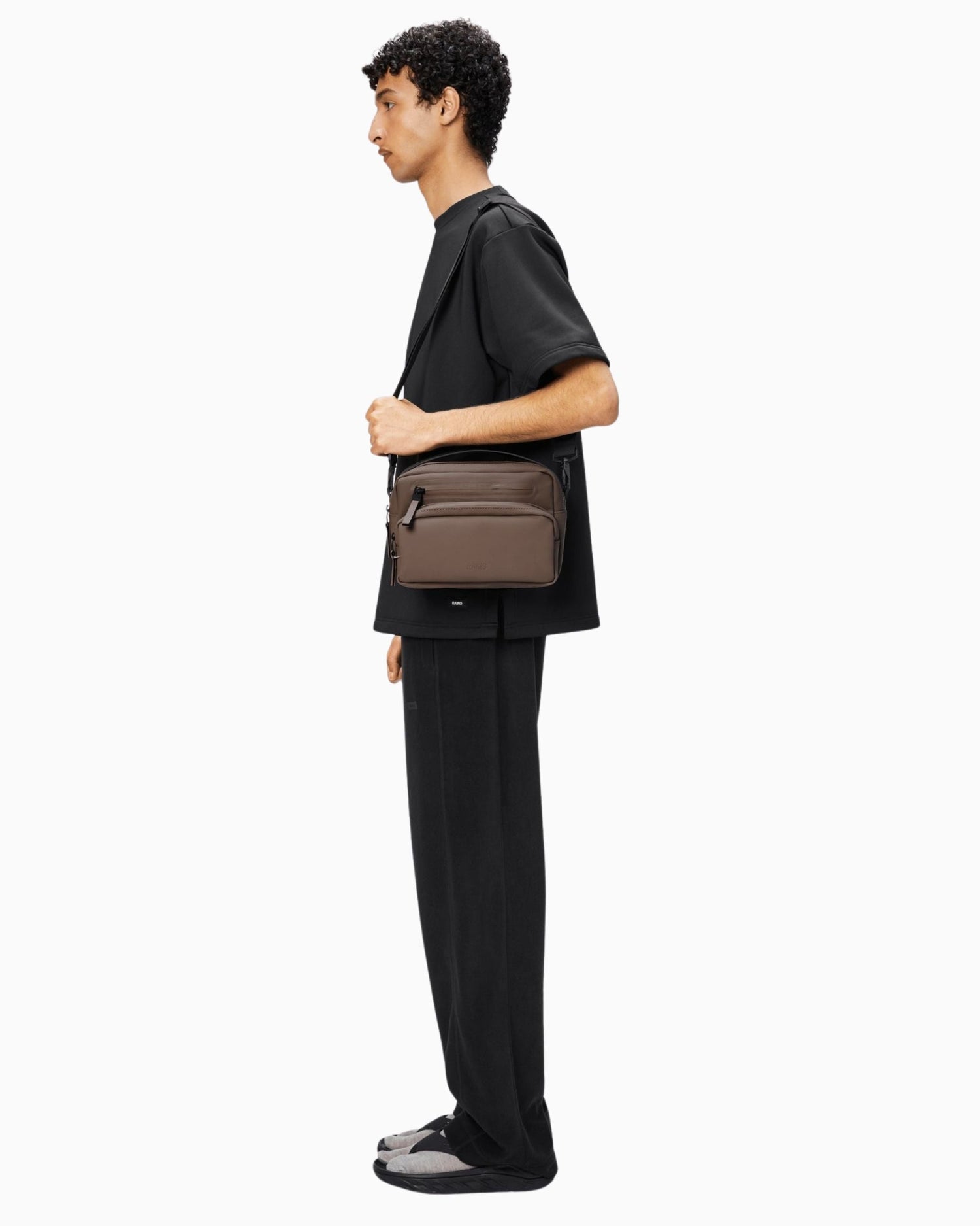 Cargo Box Bag, taşıma gücü, dayanıklılık ve pürüzsüz bir his için tasarlanmış Rains'in ikonikleşen PU kumaşından üretilmiştir.