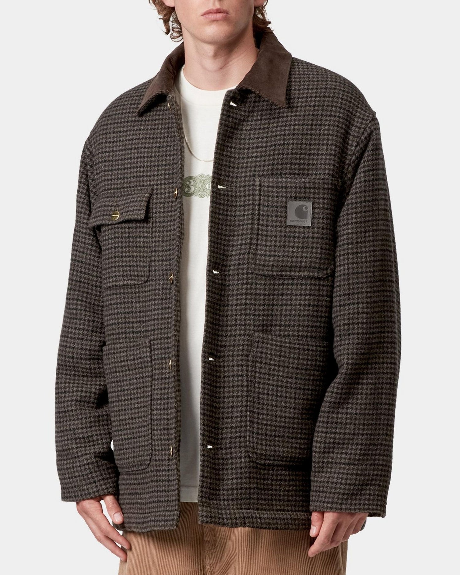 Lowis Chore Coat, ağır gramajlı poly-wool karışımı kumaştan üretilmiştir ve tamamında yer alan houndstooth deseniyle klasik bir görünüm sunar. İç kısmındaki elmas desenli kapitone astar ekstra sıcaklık sağlar. Ön yüzde toplam dört cep bulunur; ceplerden biri düğmeli kapaklı tasarlanmıştır. Yapay deri Square Label detayı ise modele şık bir dokunuş katar.