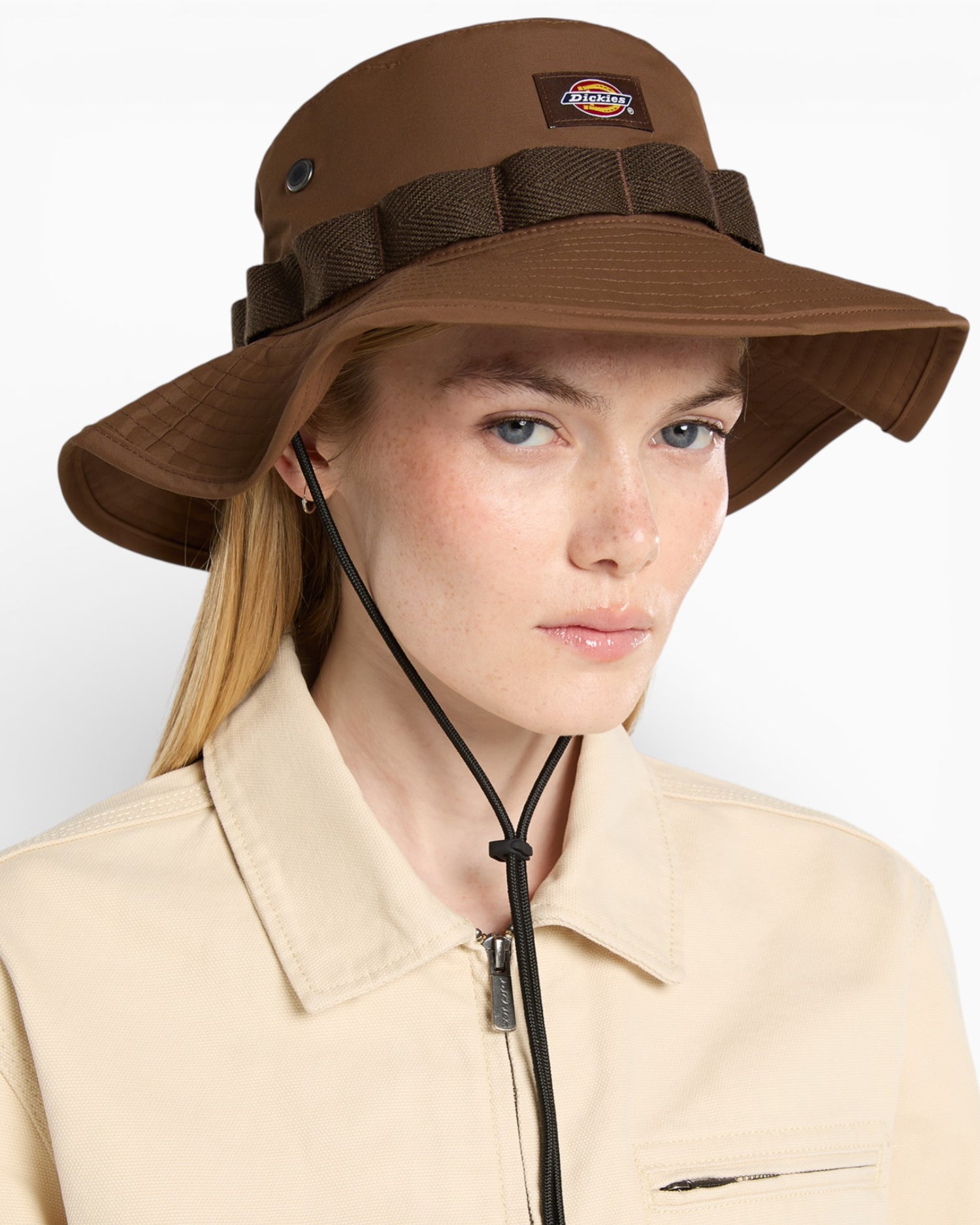 Dickies'in ordudan ilham alan şapkası, sizi sıcak yaz güneşinden korumak için mükemmel. Model, ön tarafa dikilmiş Dickies etiketine, daha fazla nefes alabilirlik için deliklere, bir kumaş bant bandına ve uyumu özelleştirmek için pratik, ayarlanabilir bir büzme ipine sahiptir.