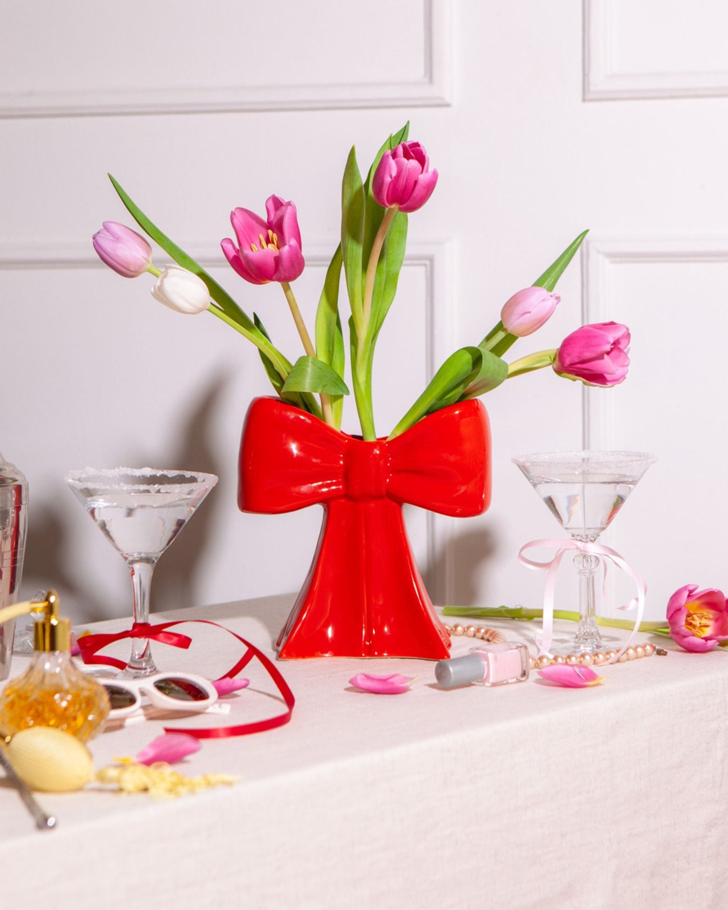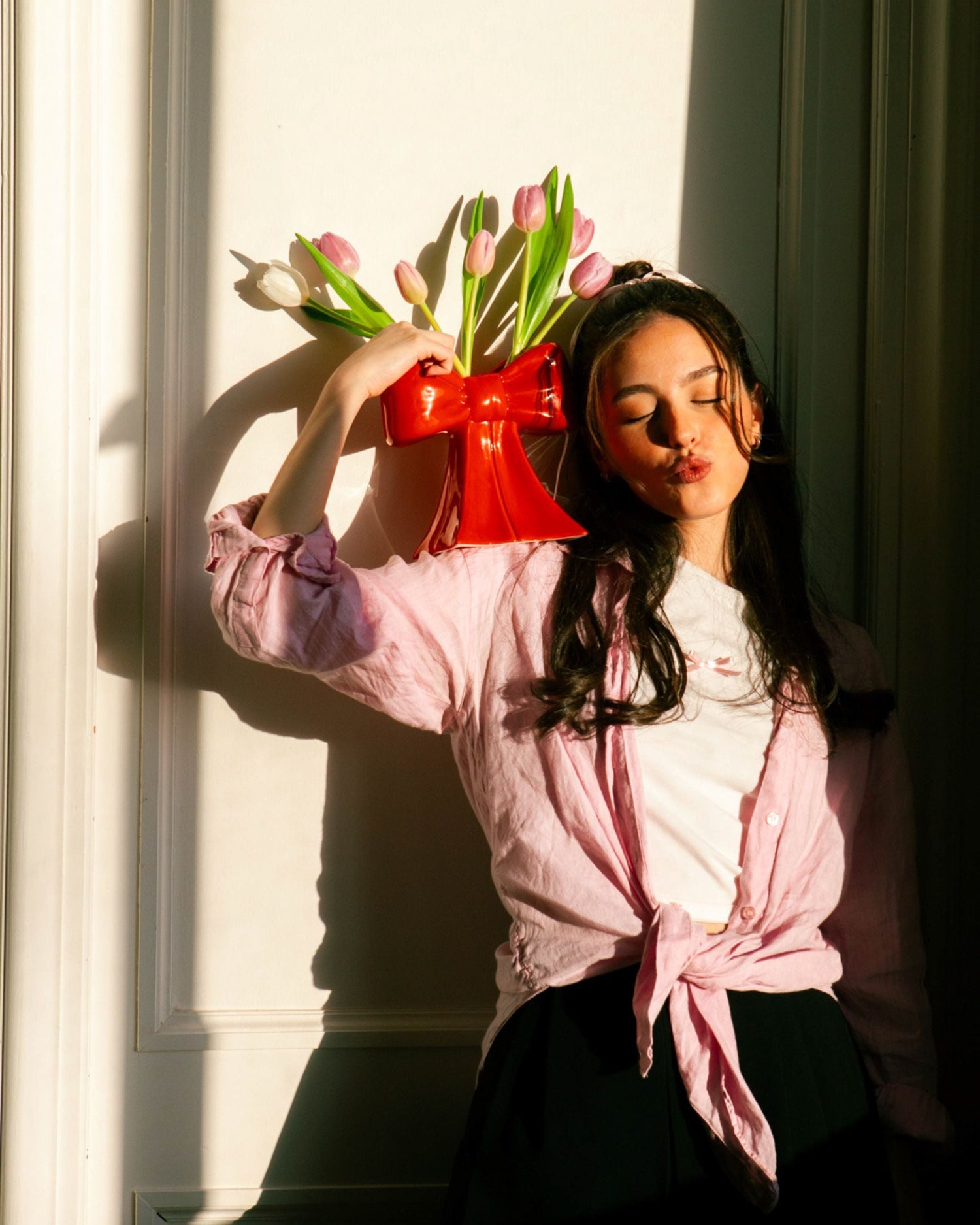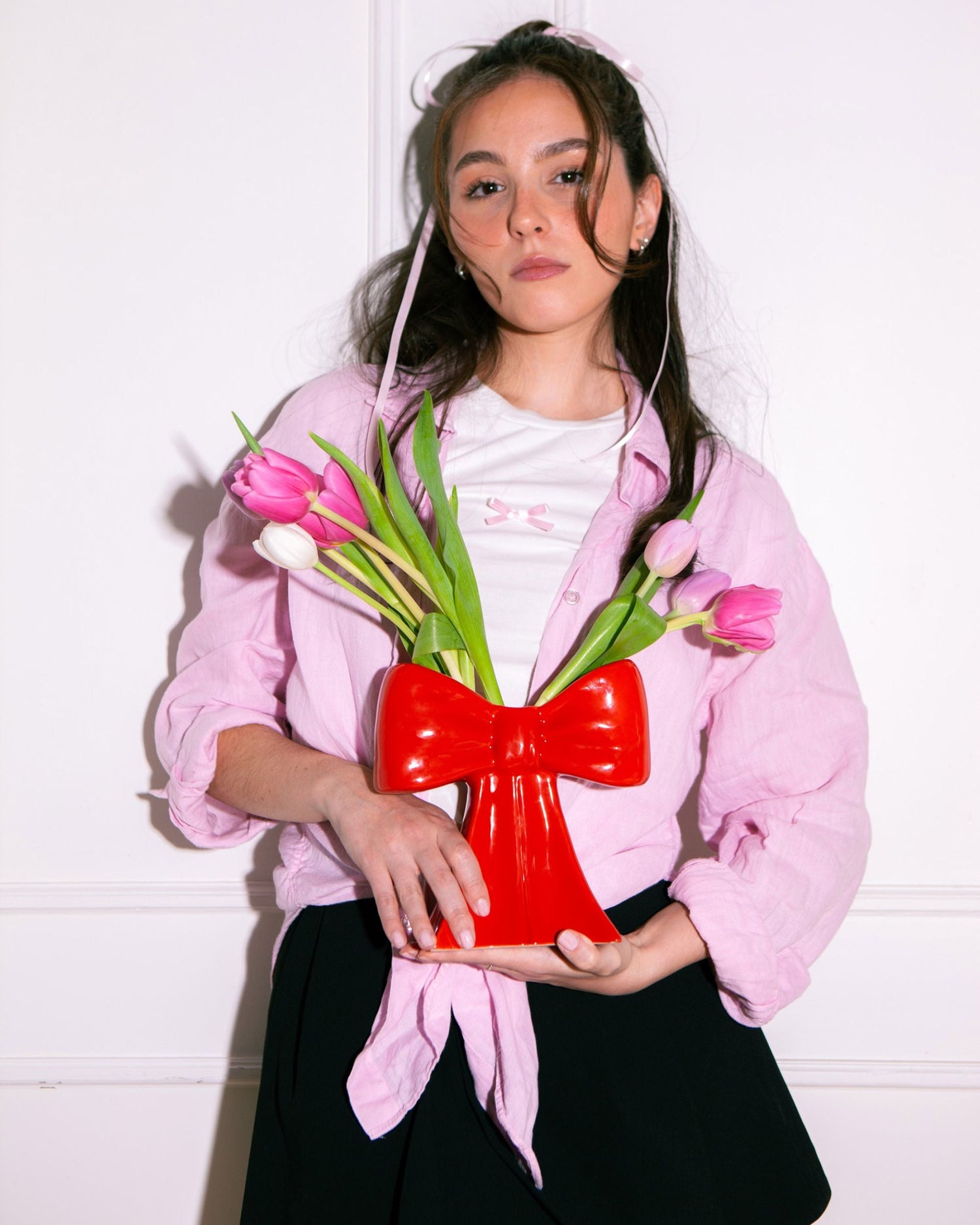 Klasik vazo formunu zarif bir fiyonk siluetine dönüştüren Bow Fiyonk Vazo, seramikten üretilmiş dikkat çekici bir dekoratif objedir. Bale dünyasının hafif güzelliğinden ve coquette estetikten ilham alan bu model, çiçeklerinize yalnızca yer değil ruh kazandırır.