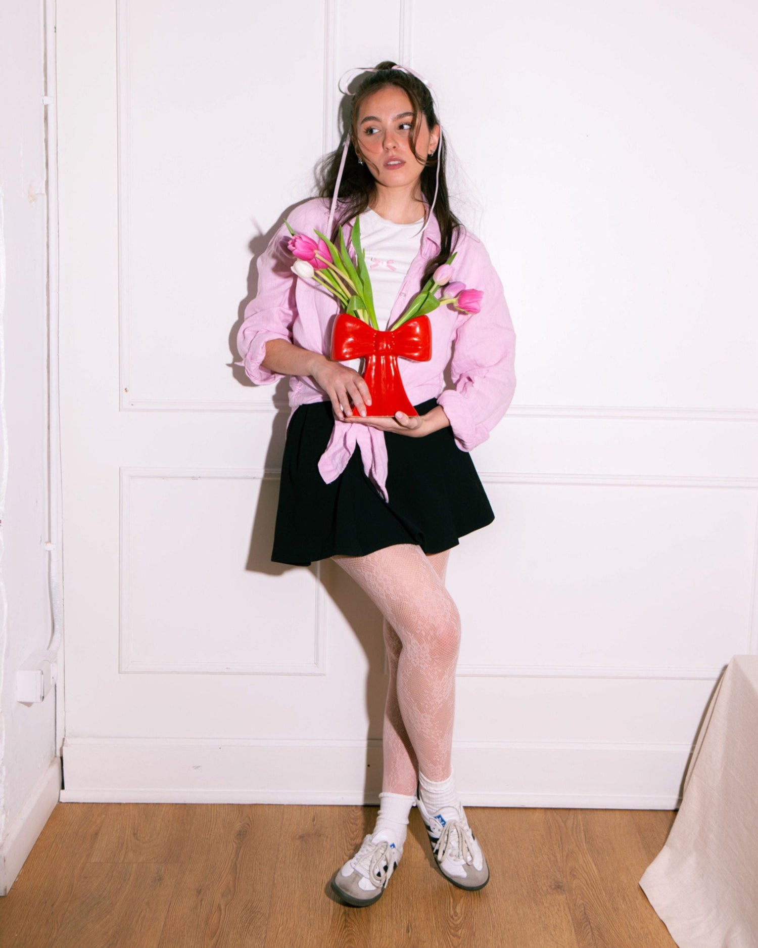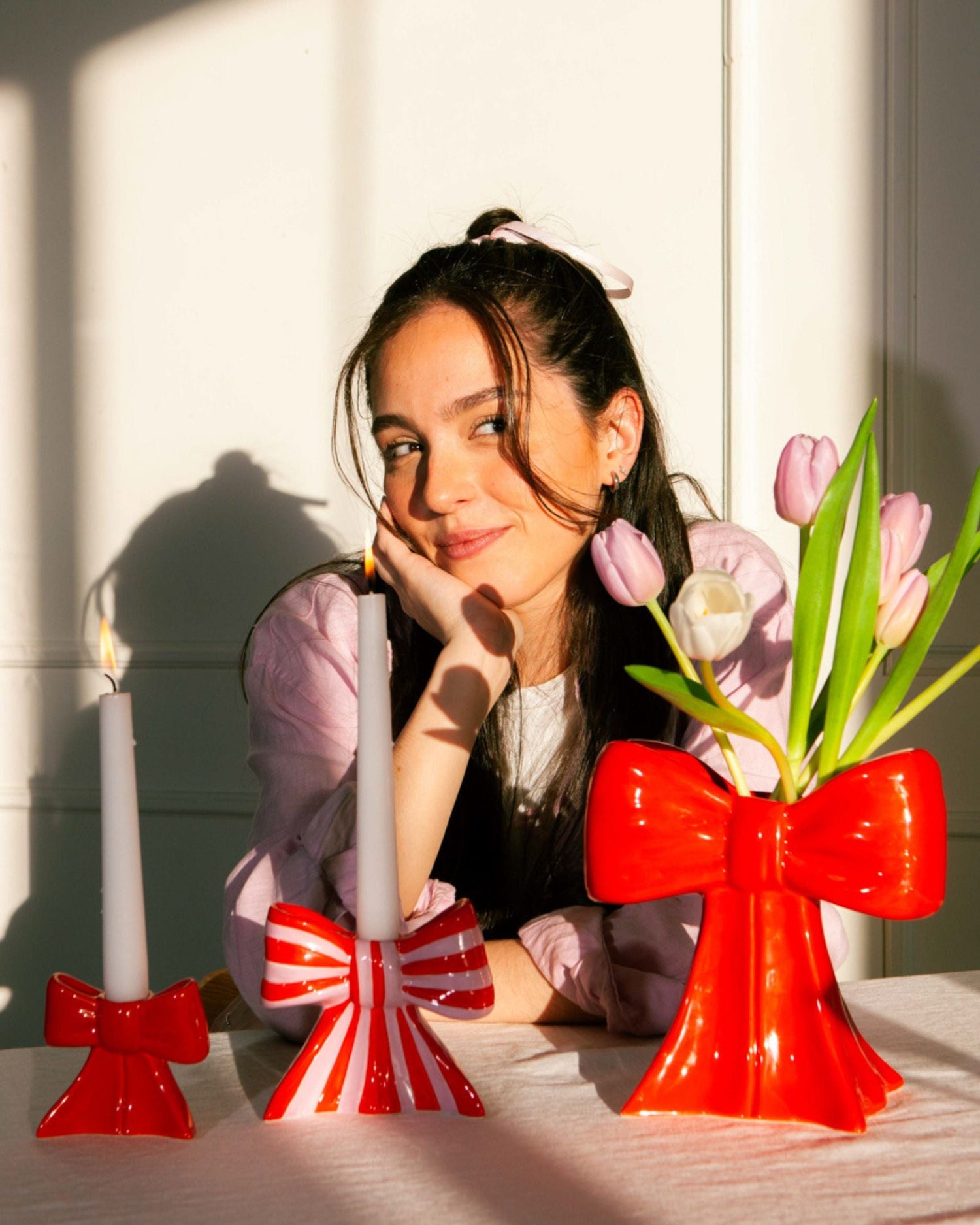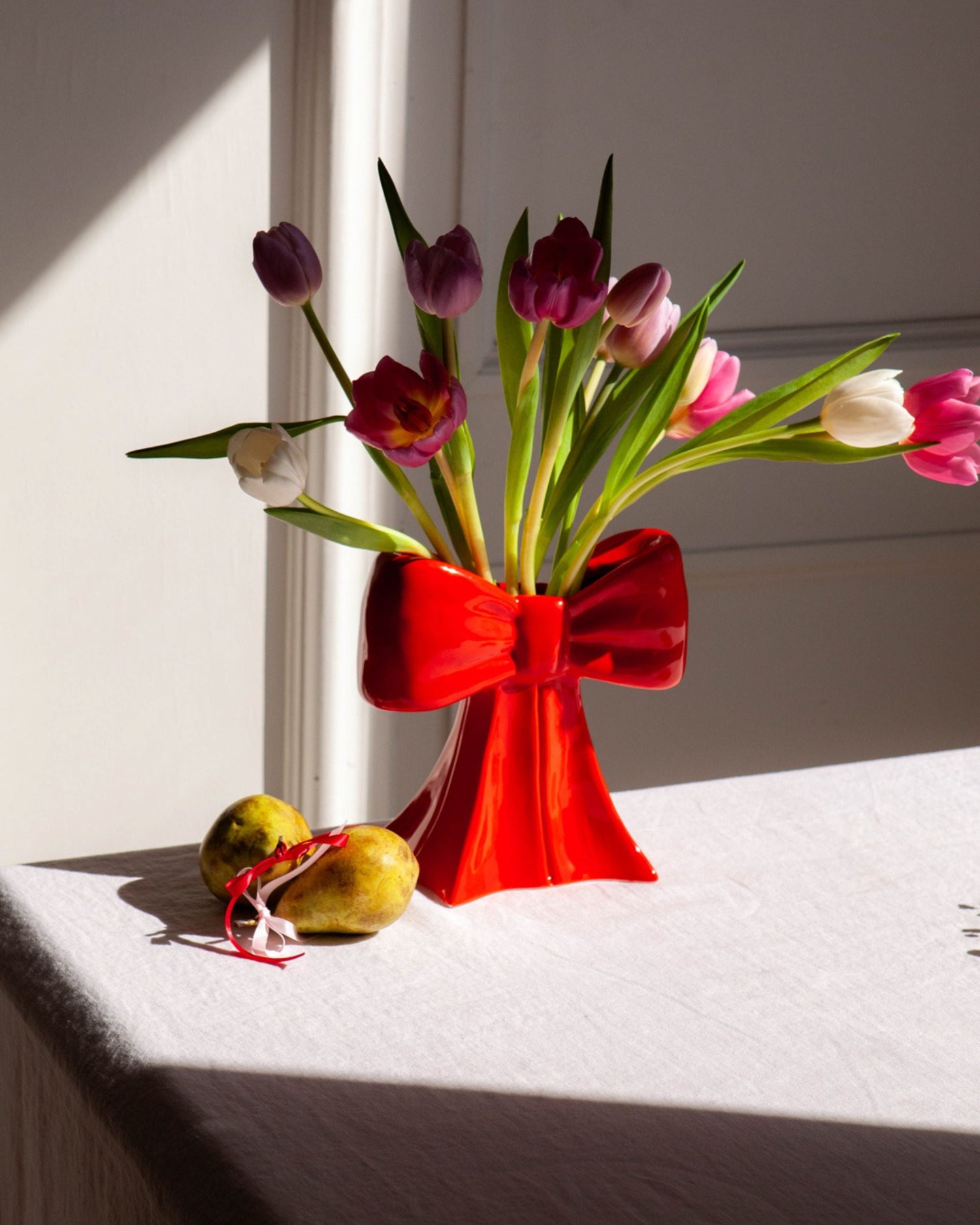 Klasik vazo formunu zarif bir fiyonk siluetine dönüştüren Bow Fiyonk Vazo, seramikten üretilmiş dikkat çekici bir dekoratif objedir. Bale dünyasının hafif güzelliğinden ve coquette estetikten ilham alan bu model, çiçeklerinize yalnızca yer değil ruh kazandırır.