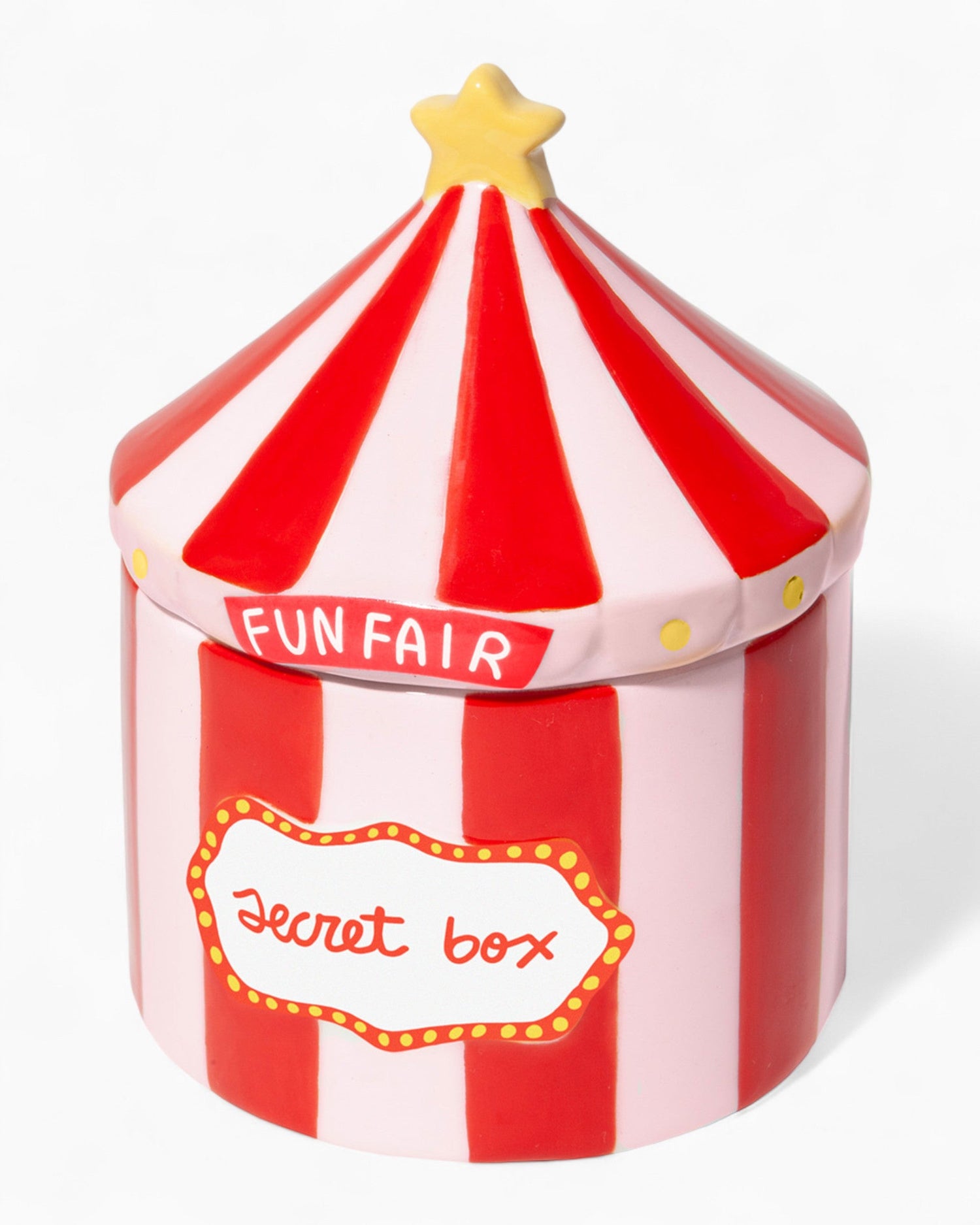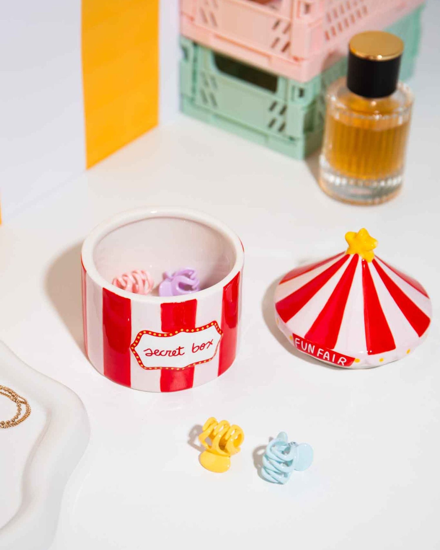 Sirkin renkli çadırlarından esinlenen Funfair Dekoratif Kutu, düzeni eğlenceyle birleştiriyor. Günlük dağınıklığı stil sahibi bir aksesuara dönüştürmek isteyenler için ideal bir seçenek.