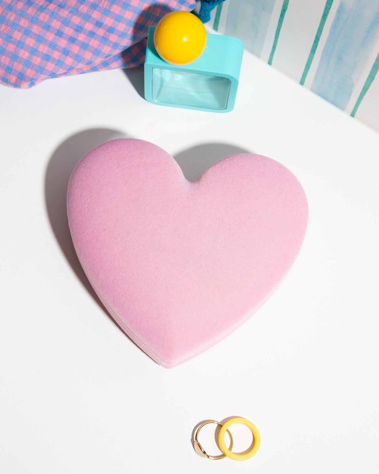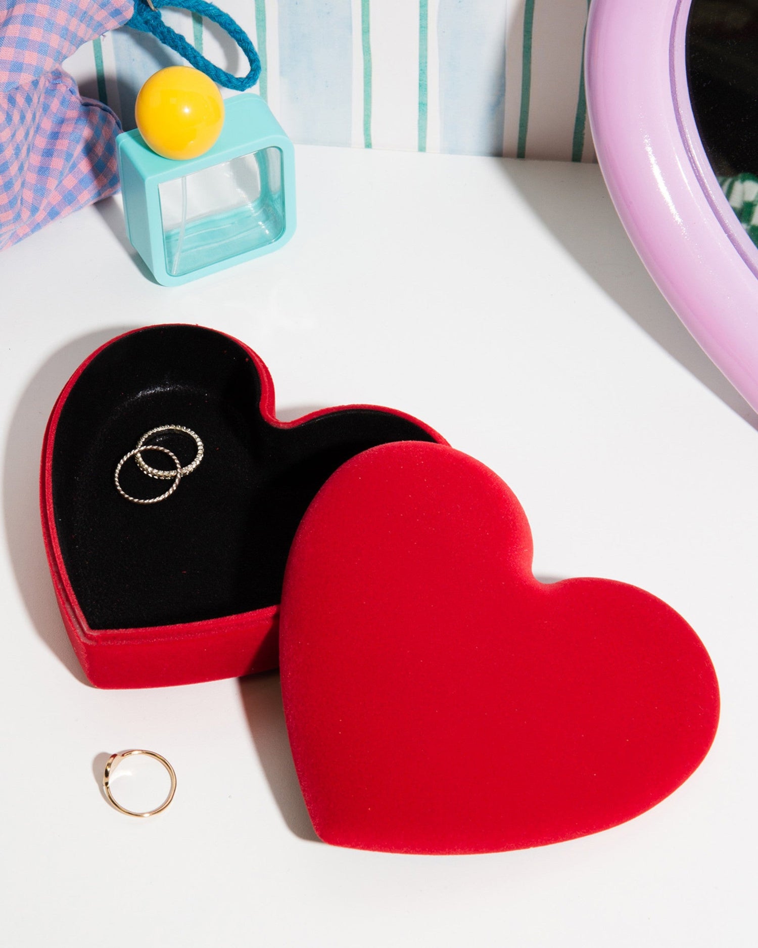 En sevdiğiniz mücevherler için zarif bir yuva. Kalp formunda tasarlanan bu kadife mücevher kutusu; yumuşak dokusu, sevimli görünümü ve şık duruşuyla hem saklama hem sunum için ideal.