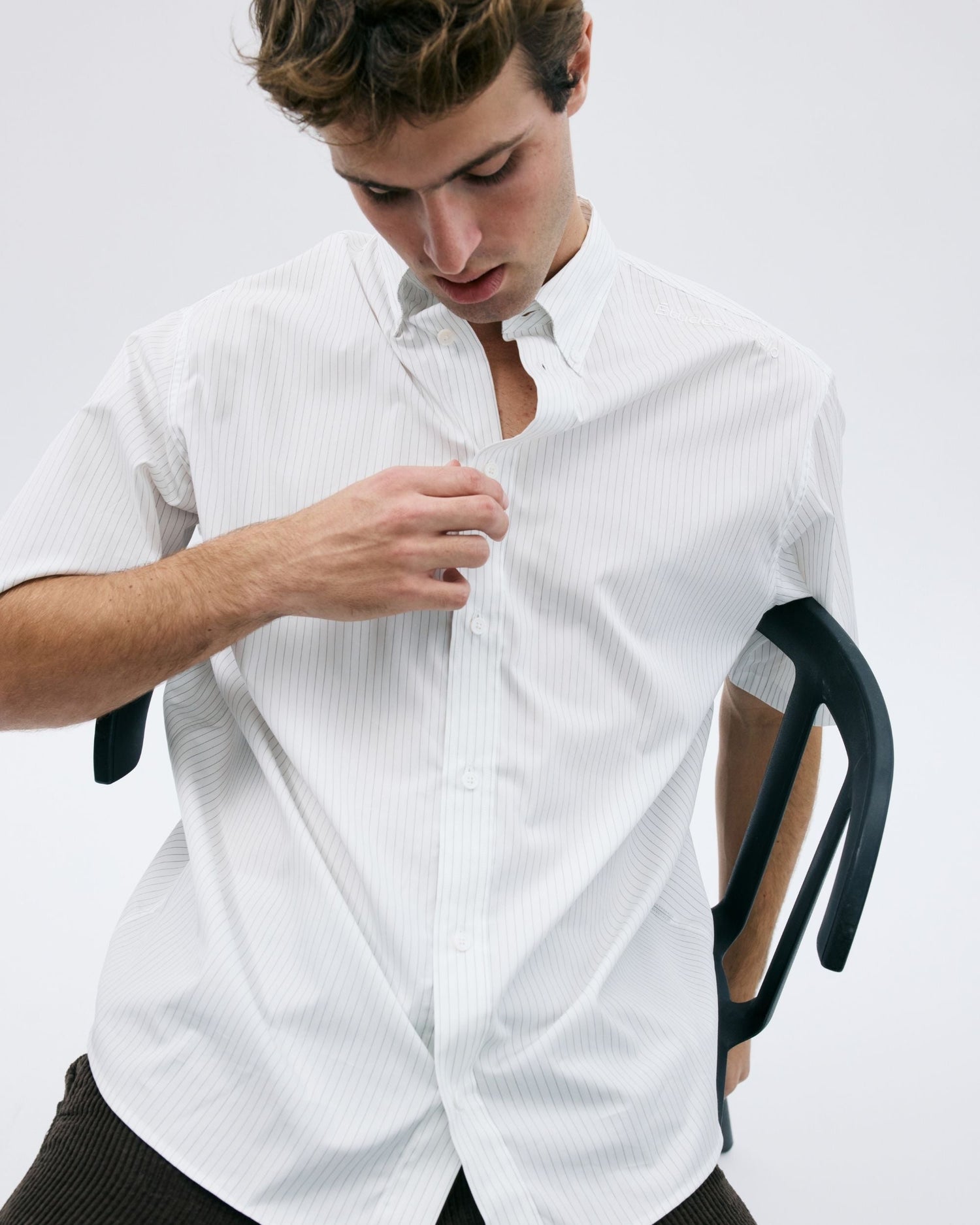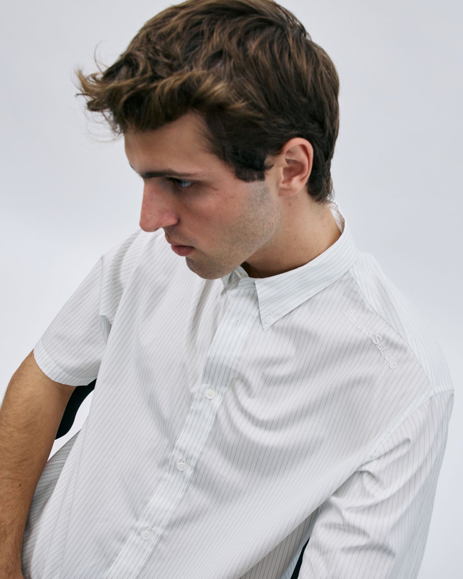 SS Relax Erkek Gömlek, sade şıklığı ve ferahlığı bir arada sunuyor. Dikey çizgili pamuk kumaşı her hareketle stilinizi ön plana çıkarır. Önden düğmeli klasik kesim, hem resmi hem gündelik ortamlarda kullanım olanağı sunar; sol omuz üstündeki ton sür ton “Études Studio” nakışı ise minimalist bir imza taşır.