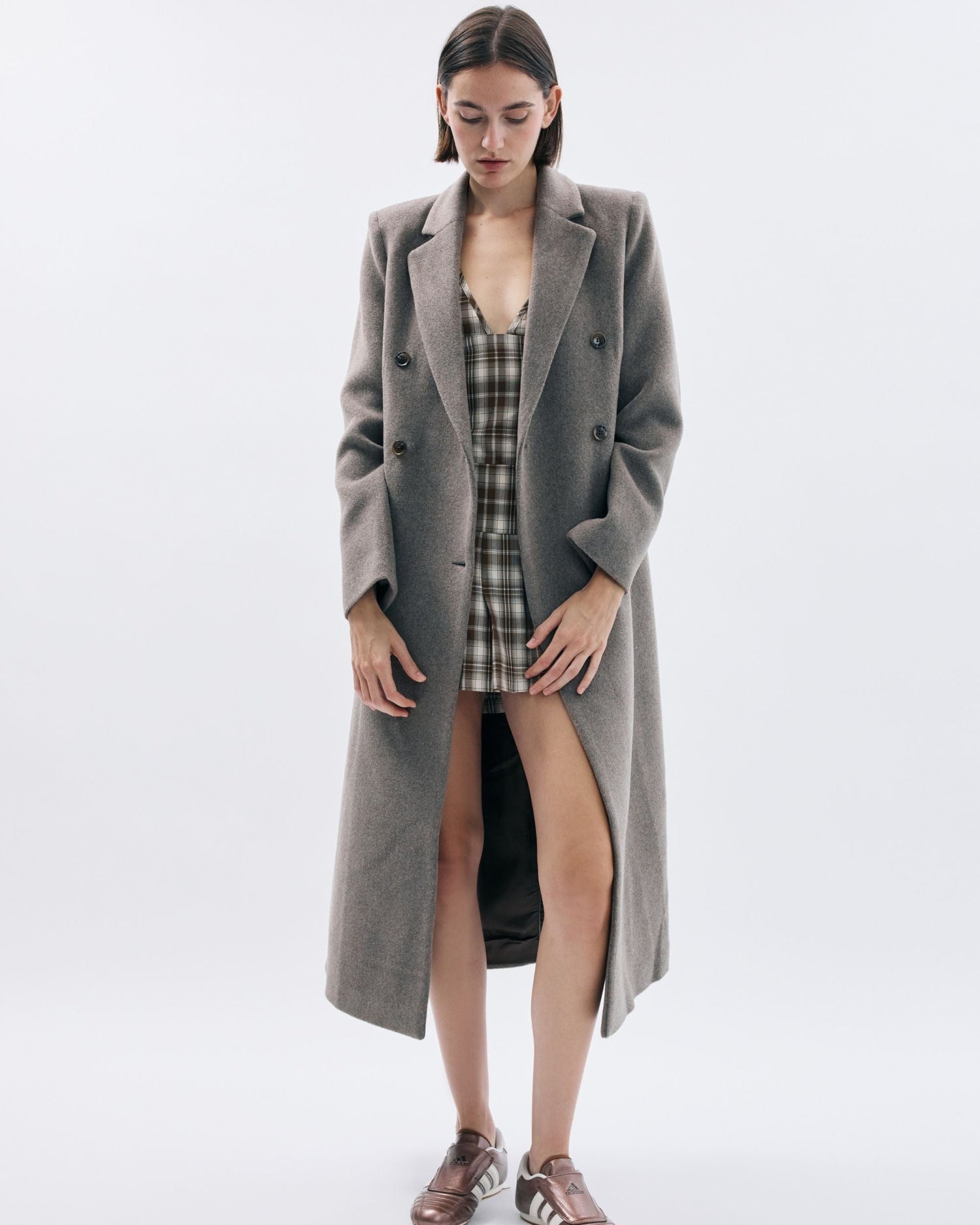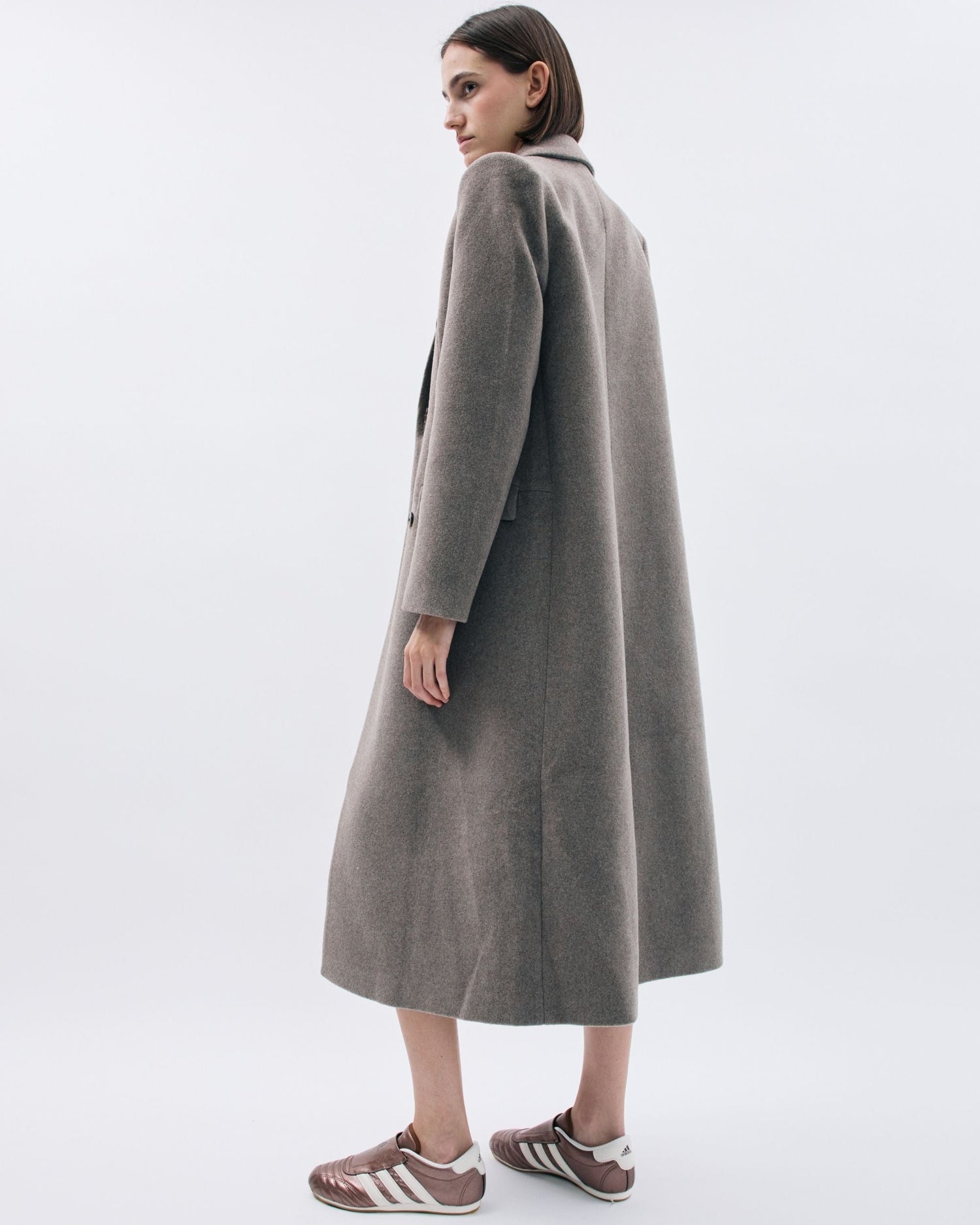 Straight fit, şık ve modern uzun palto. Çift sıra düğmeli ön kapama ile zamansız bir stil sunmaktadır. Çentikli yaka ve ön kapaklı cepler, sofistike bir görünüm katar. Arkadaki uzun yırtmaç, hareket özgürlüğü sağlarken tamamen astarlı yapısı ekstra konfor sunar. İtalya’da üretilen ana kumaşı, çevre dostu geri dönüştürülmüş yün ve polyester karışımından dokunmuştur.