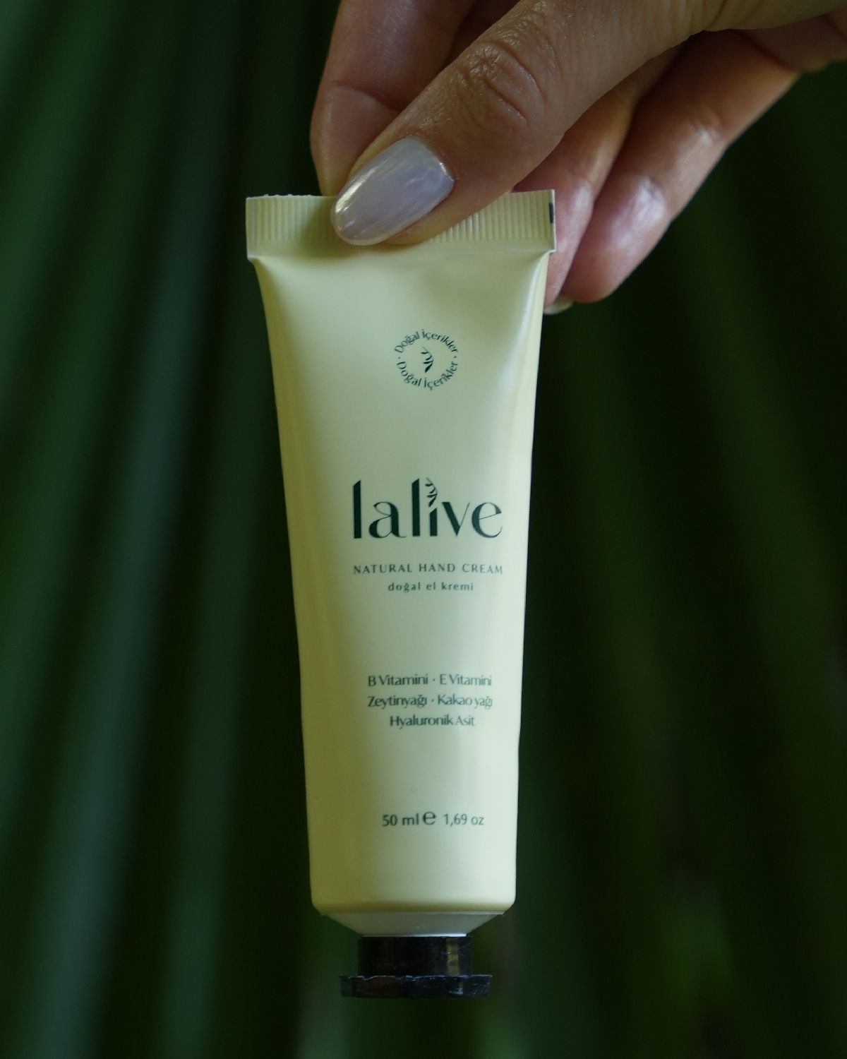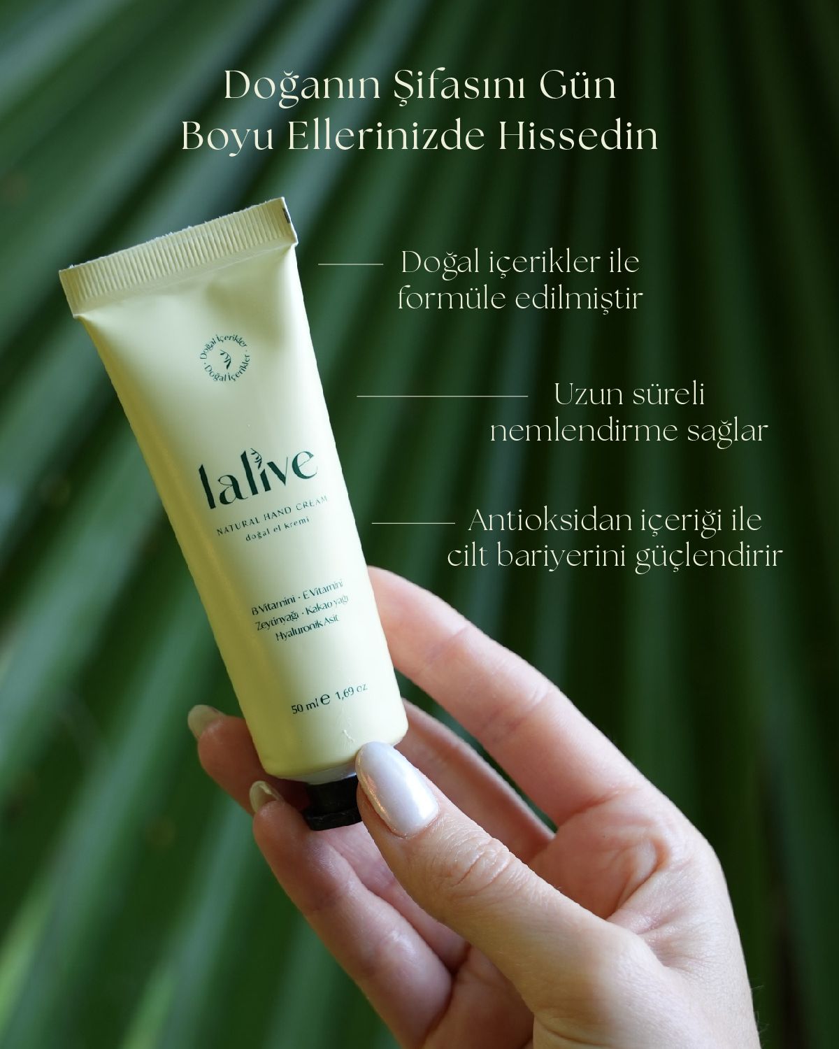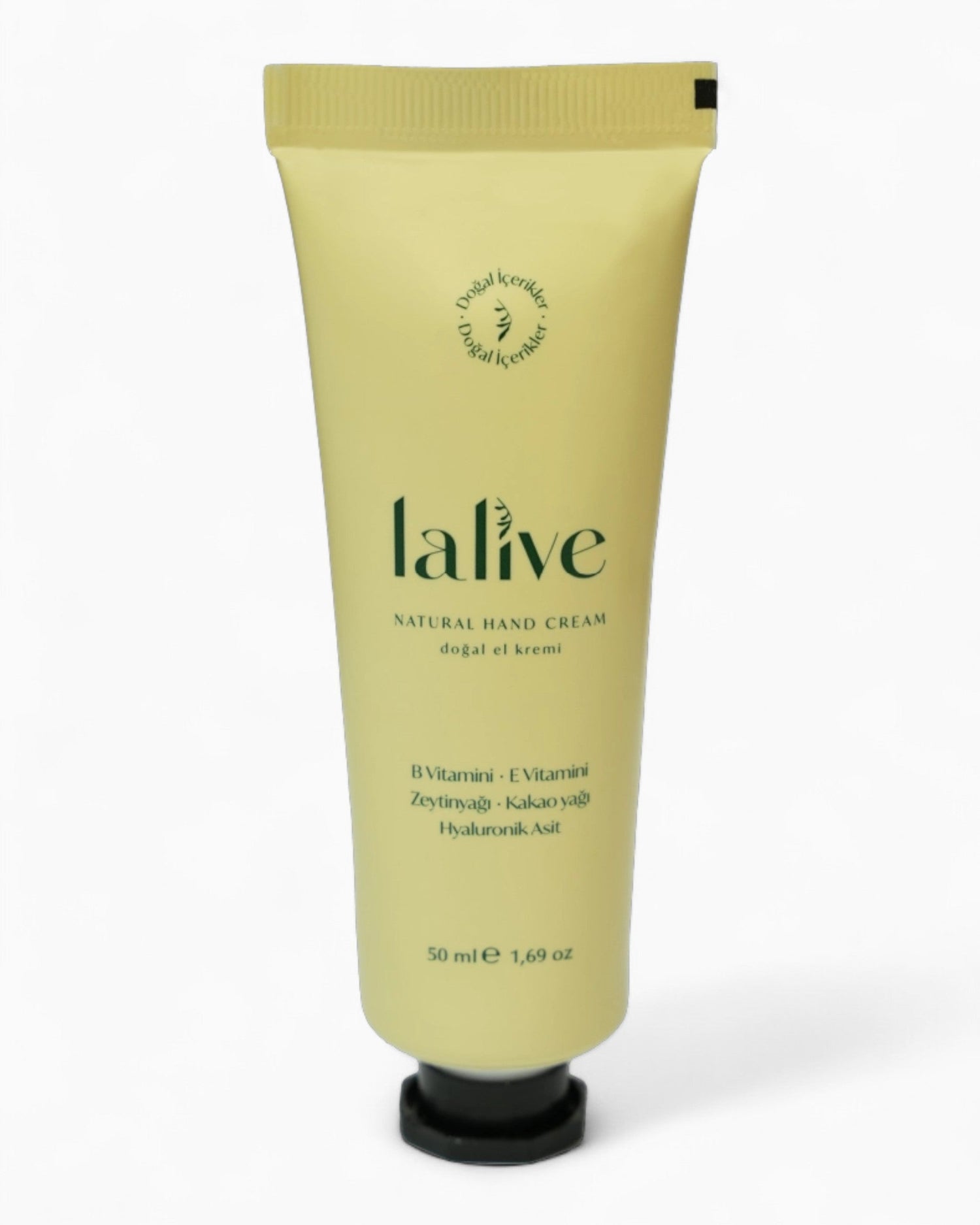 Doğal özlerle geliştirilmiş, bitki bazlı el kremi. Lalive Doğal El Kremi, hafif ve hızlı emilen formülüyle gün boyu nemlendirme ve koruma sağlar. Zeytinyağı, shea, kakao ve jojoba yağları elleri derinlemesine beslerken; aloe vera ve niasinamid cildi yatıştırır, hyalüronik asit ise yağlı bir his bırakmadan uzun süreli nem sunar.