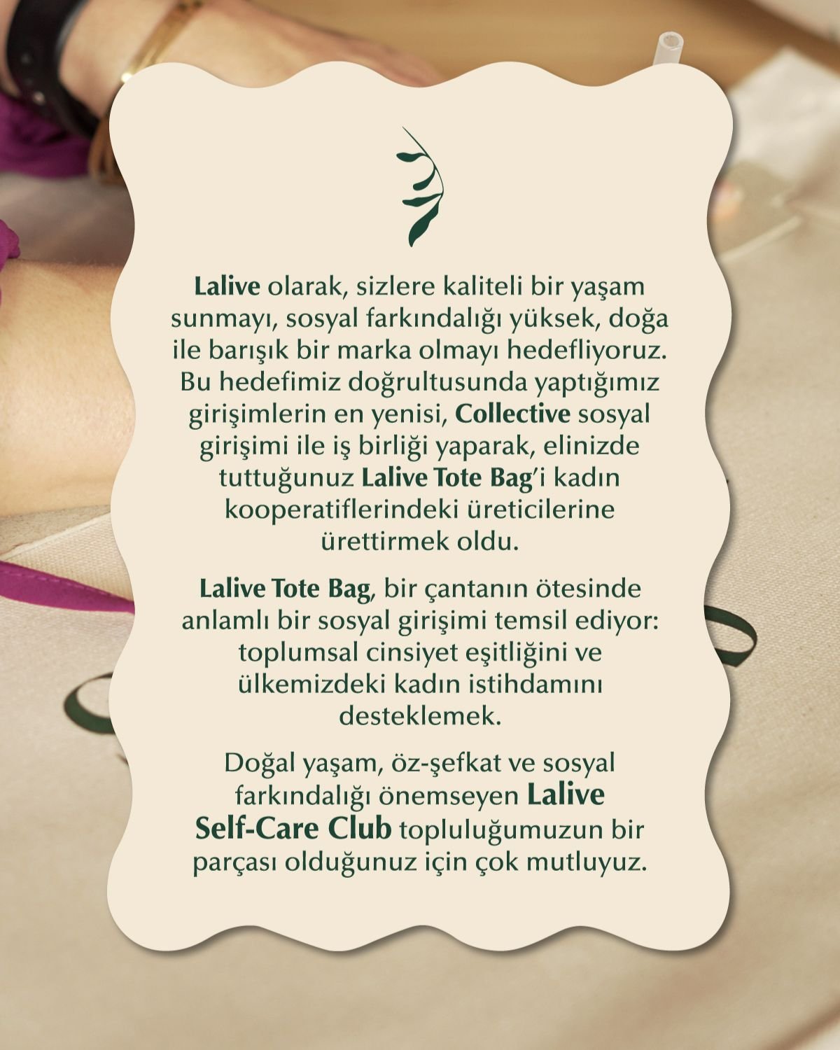 Lalive Self-Care Club’ın bir parçası olan Tote Bag, doğal yaşamı, öz-şefkati ve sosyal farkındalığı önemseyen topluluğa katılmanız için sizi davet eder.