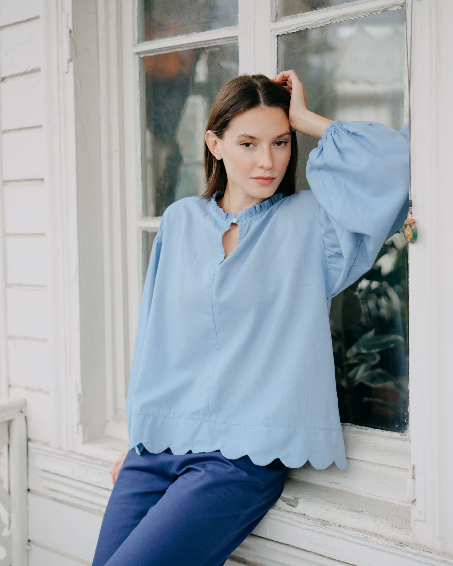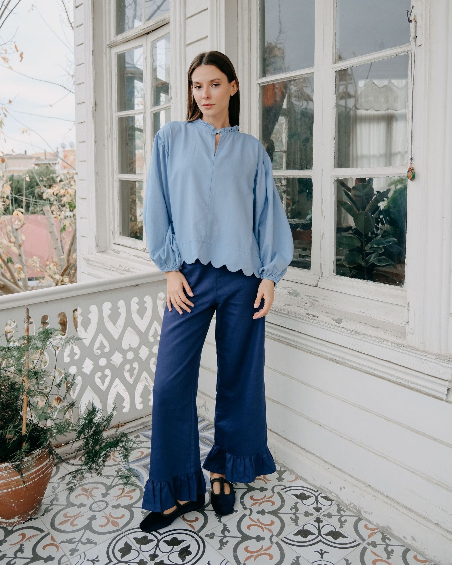 Mama in Love’ın ikonik Margot Bluzu, dilimli etek ucu detayıyla yeniden yorumlanıyor. Fırfır detaylı bisiklet yaka üzerinde yer alan V kesim mini dekolte ve tek sedef düğme, tasarıma zarif bir vurgu katıyor. Balon kolların ucundaki lastikli bitiş, silüeti dengelerken rahat bir kullanım sunar. Tam kalıbıyla gün boyu konforlu ve dengeli bir duruş sağlar.