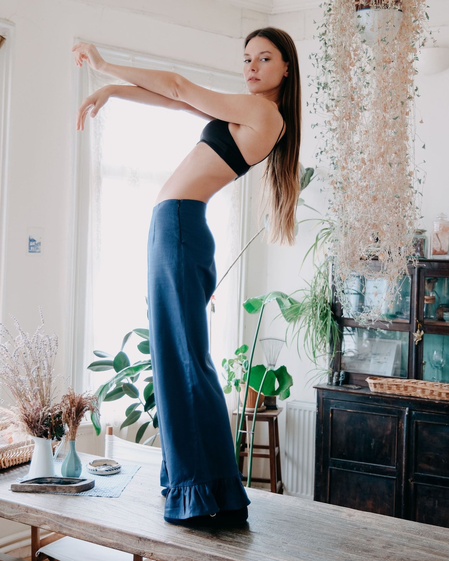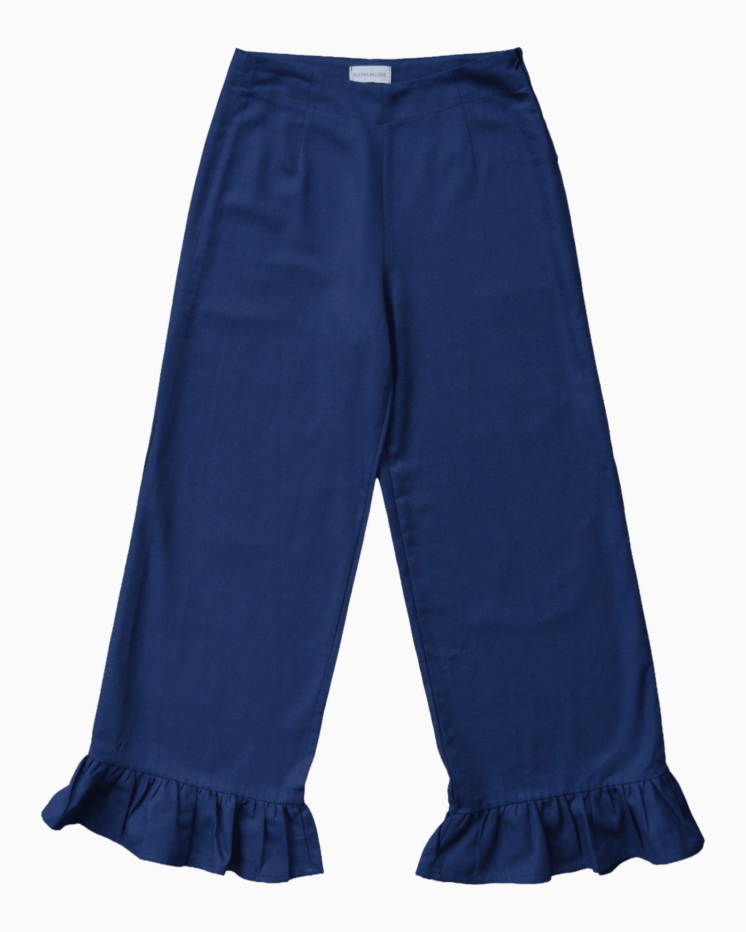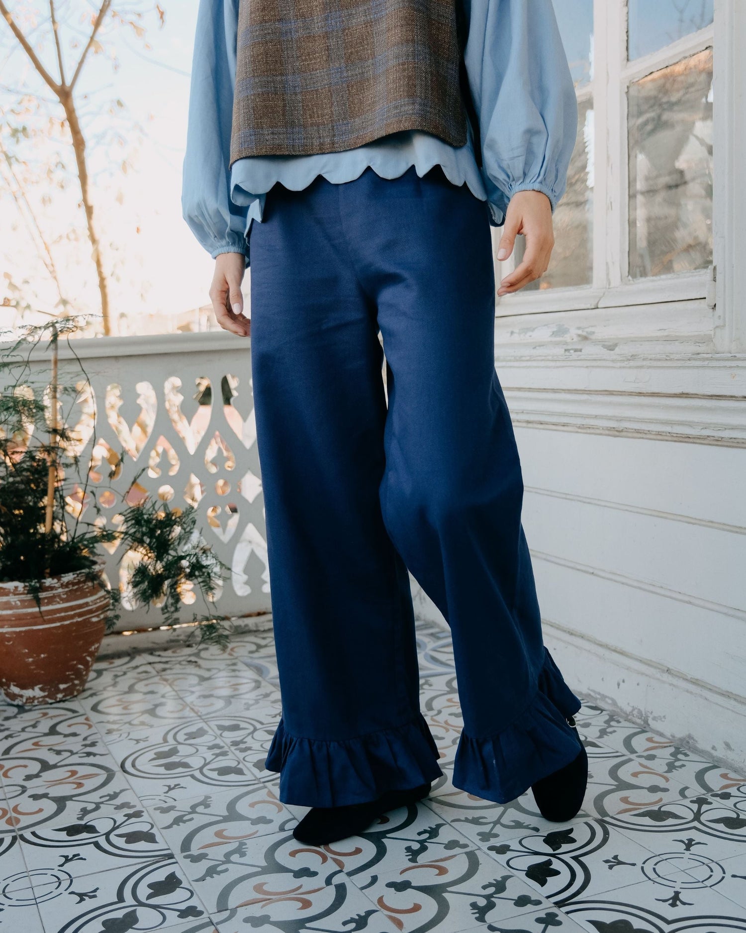 Mama in Love Frill Pantolon, düz kesimi ve bol paça formuyla zamansız bir silüet sunar. Lacivert tonlardaki ince ve tok kumaşı şık bir duruş sağlarken, bilek boy paçalarında yer alan fırfır detayları tasarıma karakterli ve zarif bir dokunuş ekler. Fermuarlı bel yapısı rahat bir kullanım sunarken, tam kalıbı gün boyu konforlu bir giyim deneyimi sağlar.