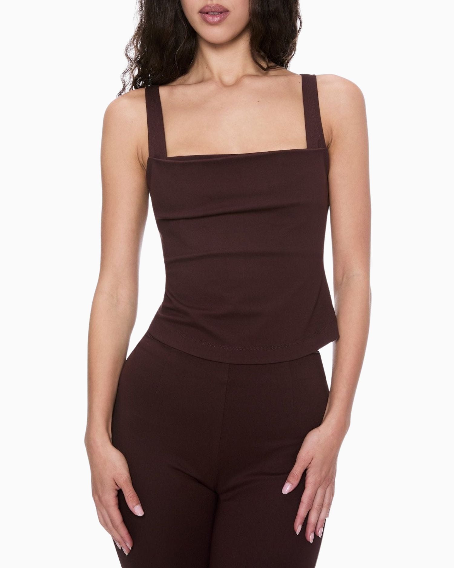 Luna Top – Chocolate, zarif kare yakası ve yapısal duruşuyla gardıroplara sofistike bir hava katıyor. Vücudu kusursuz saran orta kalınlıkta rayon-nylon-elastan karışımı kumaşı, hem tok duruşu hem de gün boyu rahatlığı garanti ediyor. Koyu çikolata rengi, güneş ışığında derinleşerek zengin bir ton oyununa dönüşüyor.
