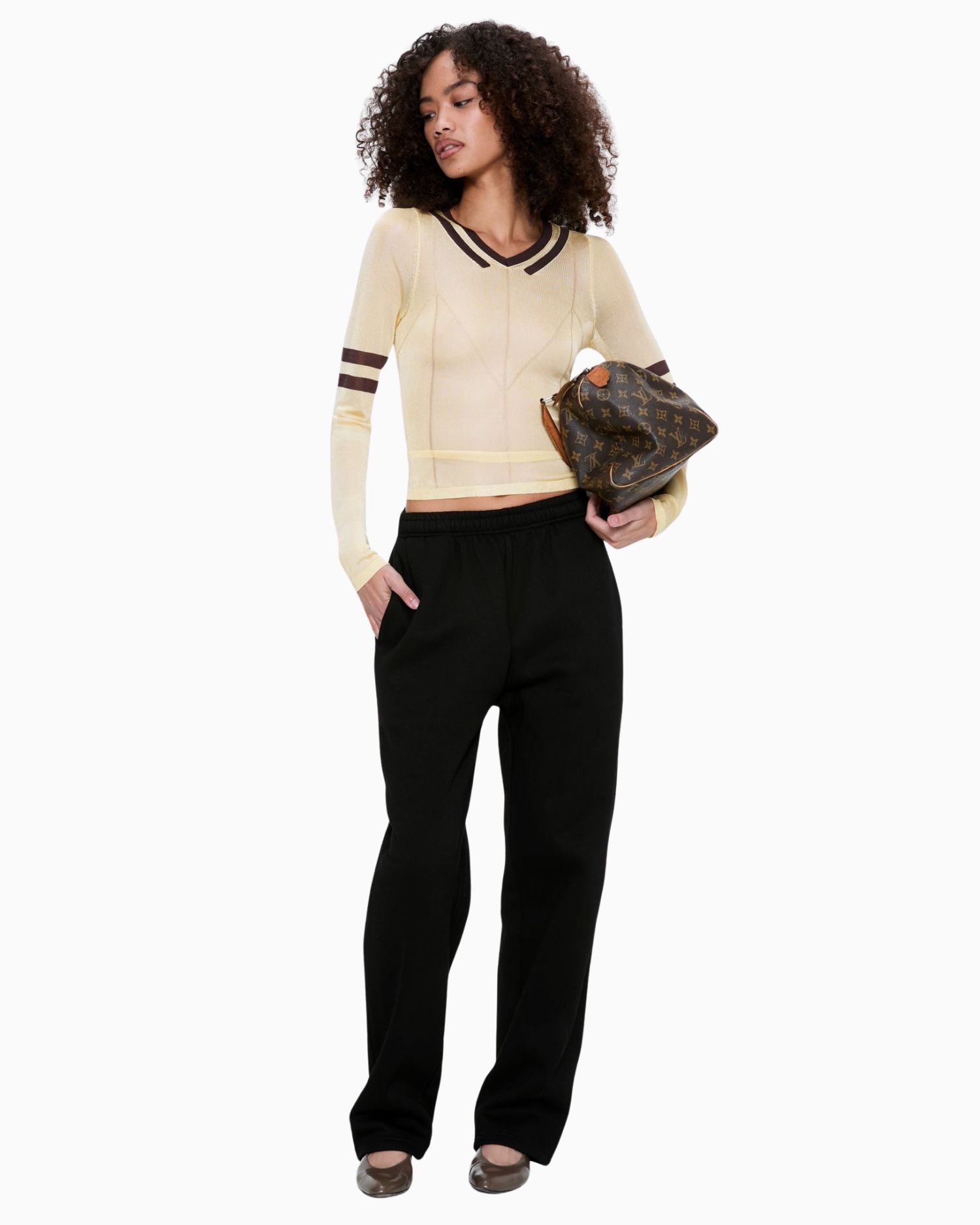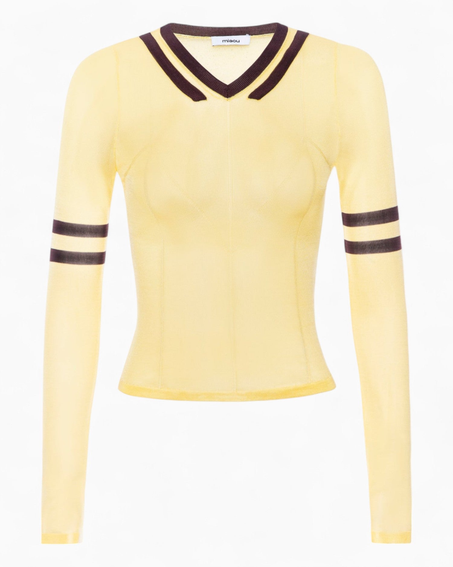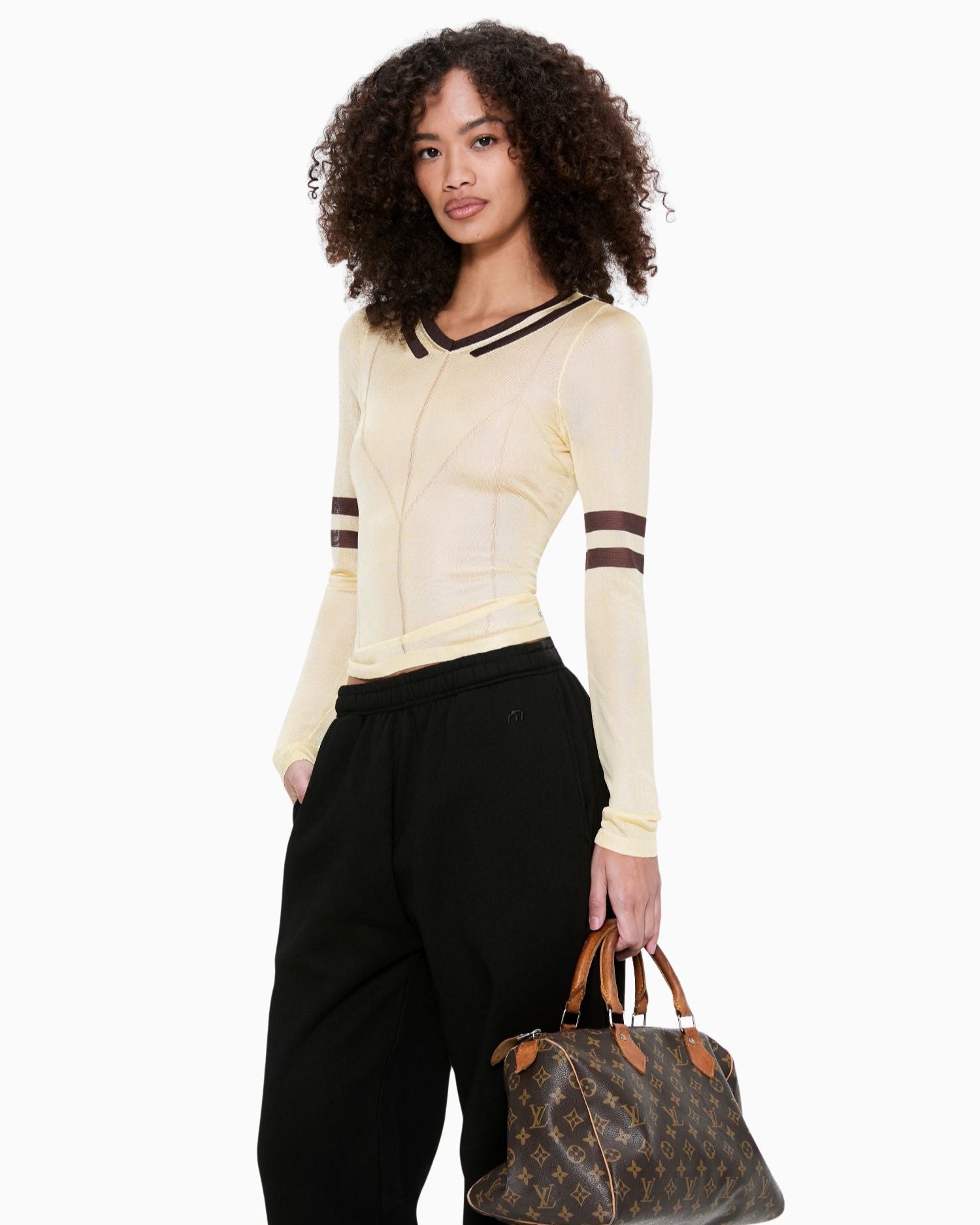 Monica Top – Butter, yüzeyi hafif şeffaf intarsia örgüsüyle gün ışığını süzen bir parça. Düz kesimi ve uzun kollarındaki sportif çizgiler, sade bir duruşa dinamik dokunuş katar. Miaou’nun parlak rayon kumaşı, vücudu nazikçe sarar.