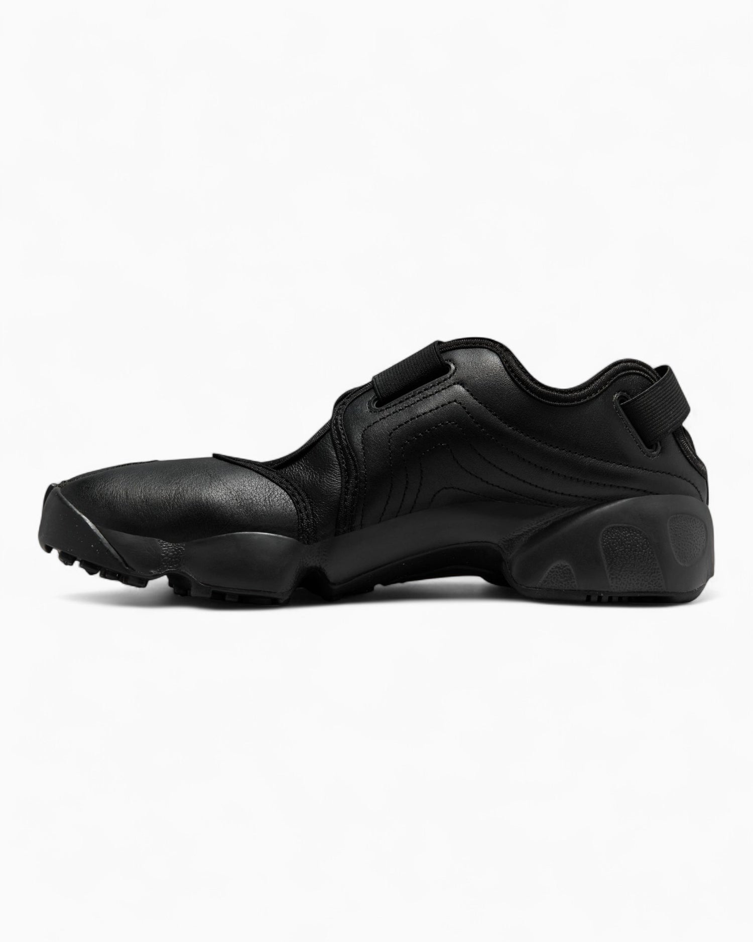 Nike Air Rift, sneaker mı sandal mı karar veremeyen ama her halükarda rahat olmak isteyenler için tasarlandı. Tamamen siyah tonlardaki görünümüyle sade ama cesur bir duruş sergiler. Tam deri sayası ve ayarlanabilir cırt cırtlı bantlarıyla ayağa kolayca oturur.