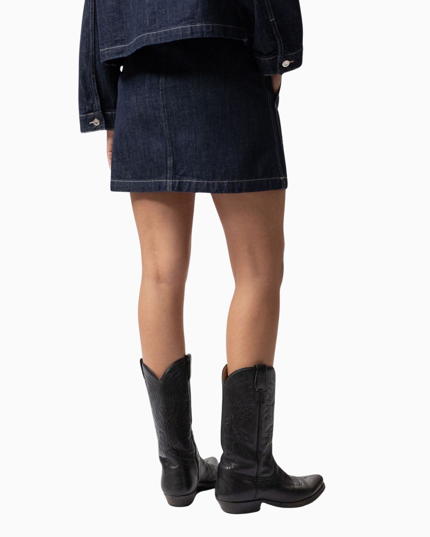 Elvy, yüksek bel ve A-line regular kesimiyle zamansız bir duruş sunar. Ekru iplikle dikilen ve patch-on ceplerle tamamlanan tasarımı, sade işçilikten ilham alırken modern bir dokunuşla yeniden yorumlanmıştır. Derin lacivert tonuyla öne çıkan denim, saf indigo boyalı redcast kumaşın özünü yansıtır. Düzensiz, dokulu iplikleriyle 20. yüzyılın başındaki denimlere selam verirken, geçmişten ilham alan çağdaş bir yorum sunar. İlk giyildiği andan itibaren dikkat çeken bu etek, zamanla daha da güzelleşir. Her kullanımda ve yıkamada farklı dokular ve kendine özgü bir karakter kazanarak eşsiz bir görünüme dönüşür.