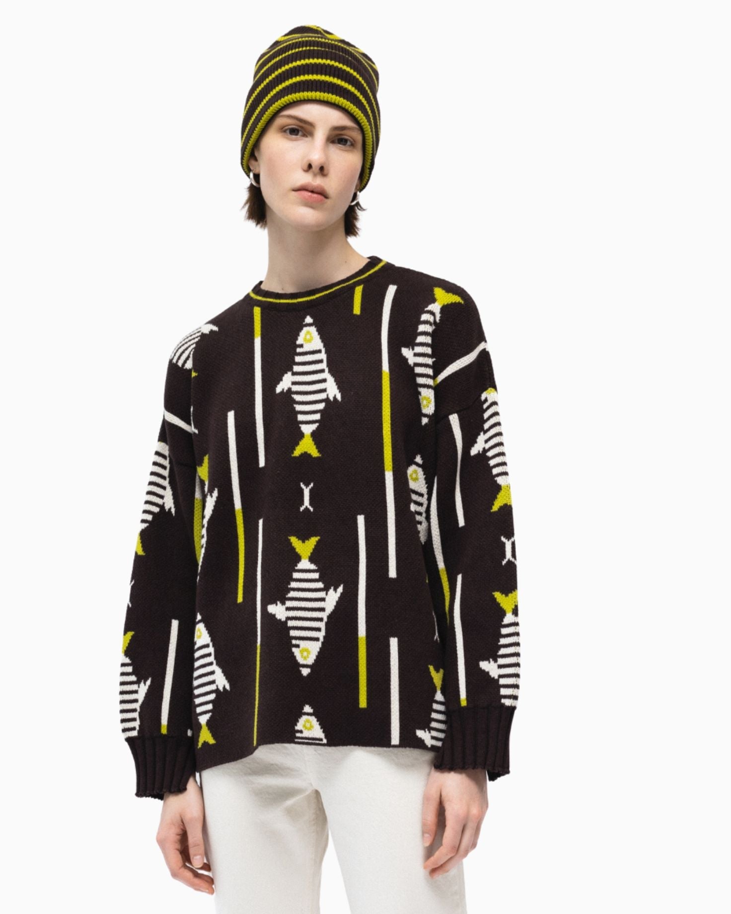 Yumuşak jakarlı dokusuyla Fish Triko Bere, minimal çizgileriyle stiline sıcak bir dokunuş katar.