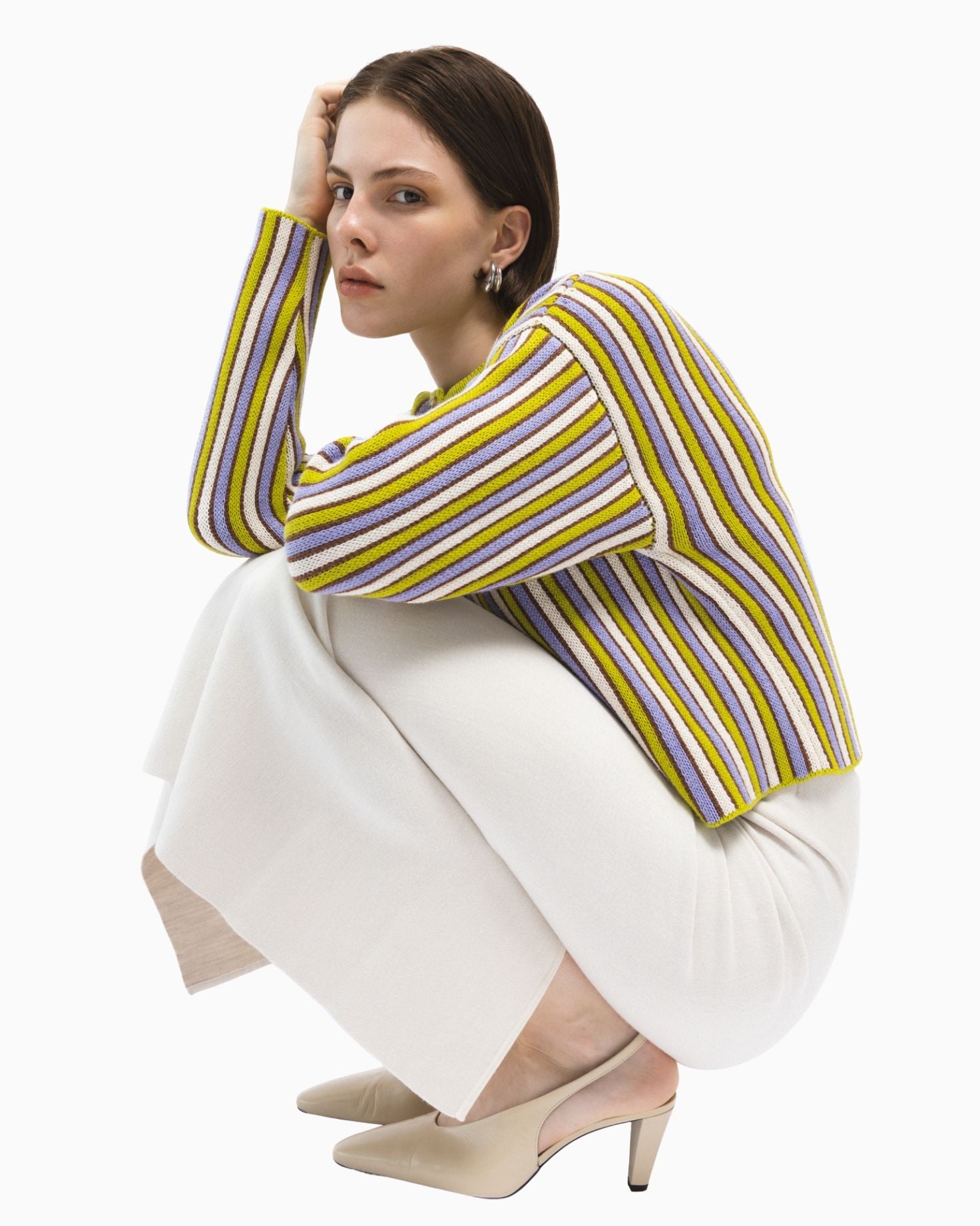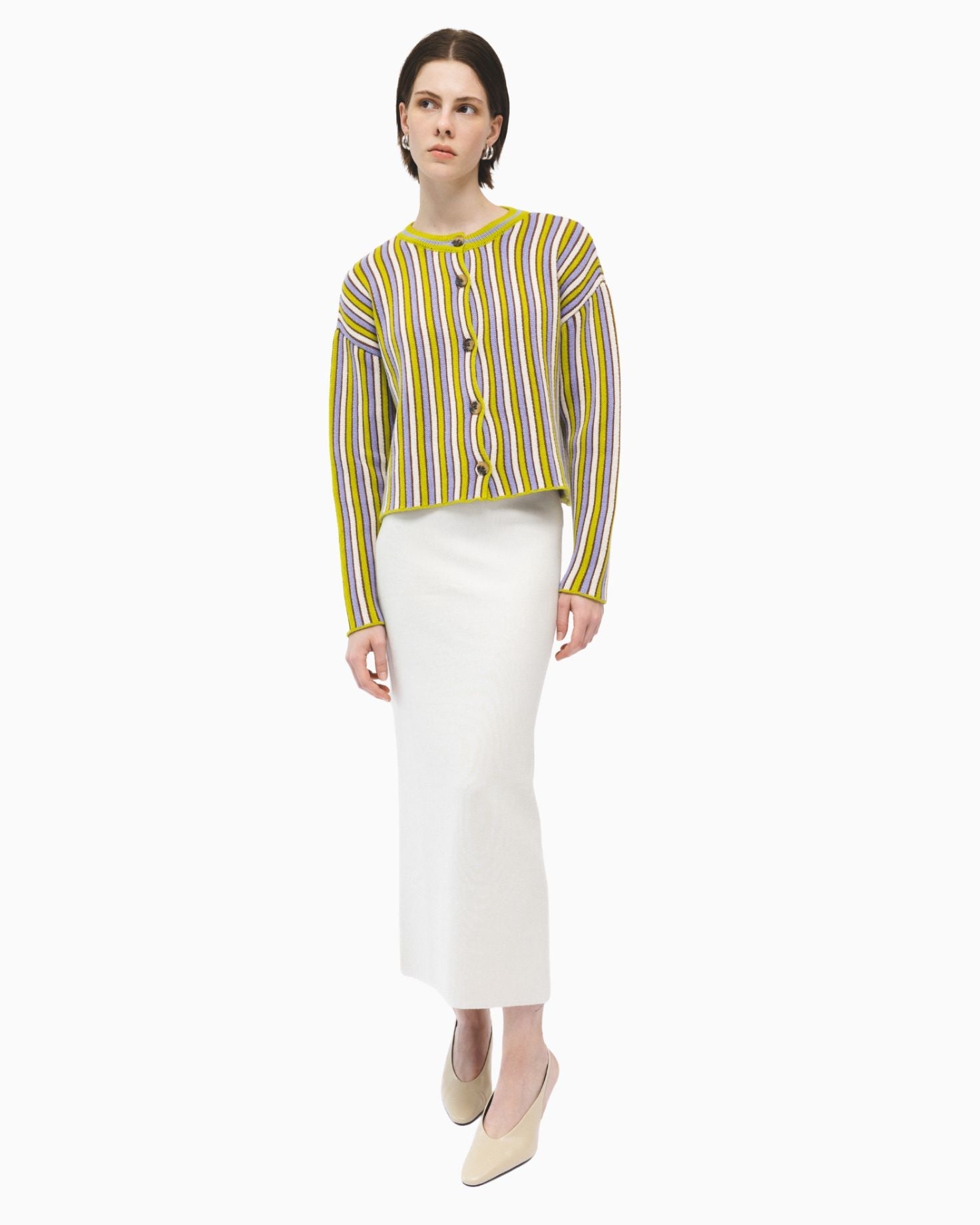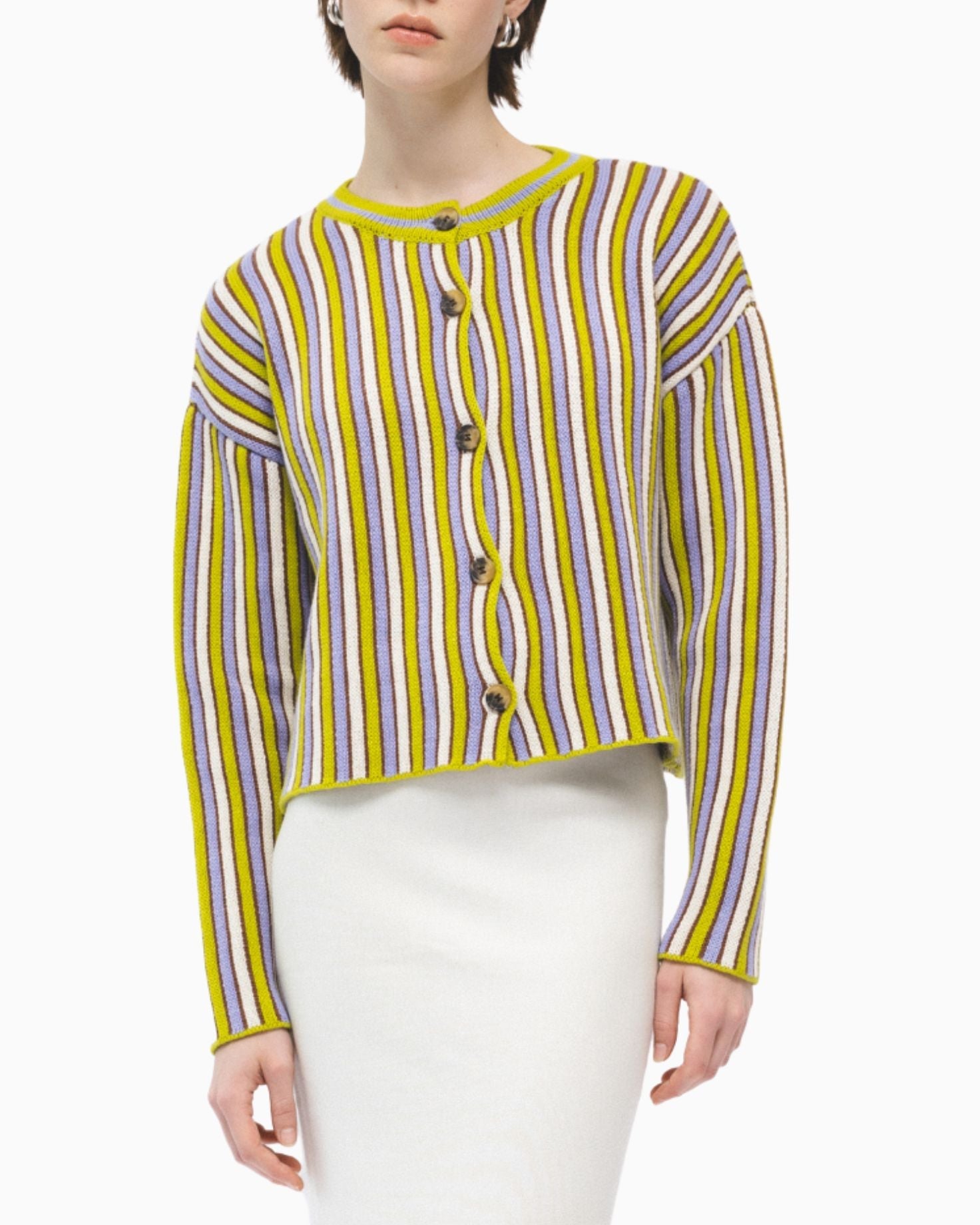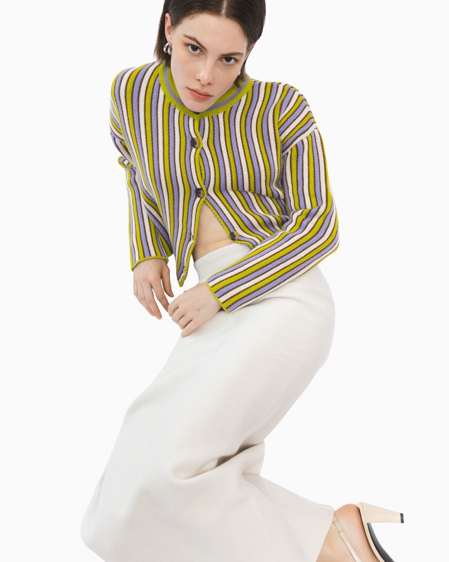 Narin çizgilerle bezenmiş Grape Çizgili Triko Ceket, jakarlı dokusuyla hem sade hem dikkat çekici bir siluet yaratıyor. Bisiklet yaka, düğmeli ve rahat kalıbıyla günlük kullanımda stilin tamamlayıcısı oluyor.