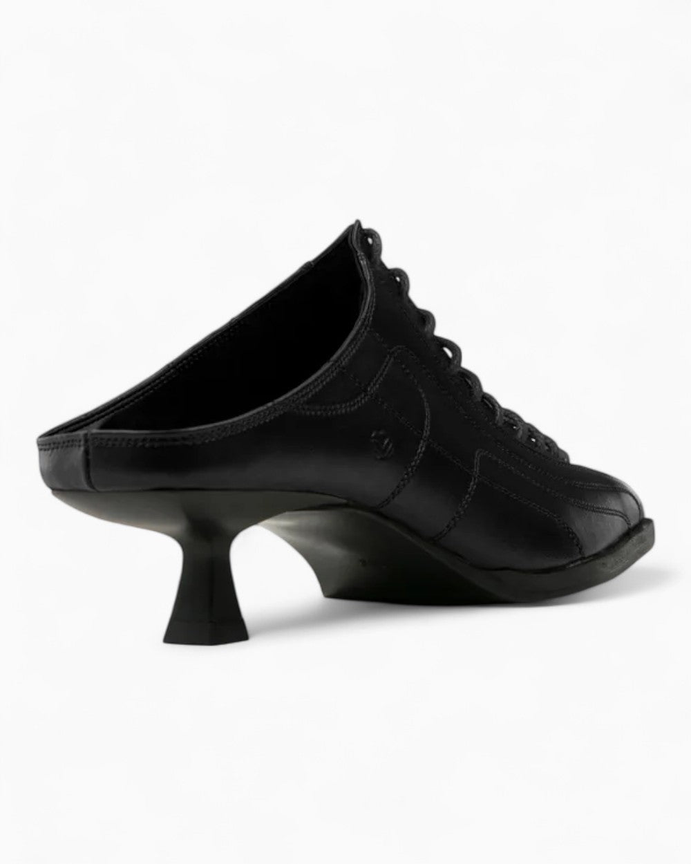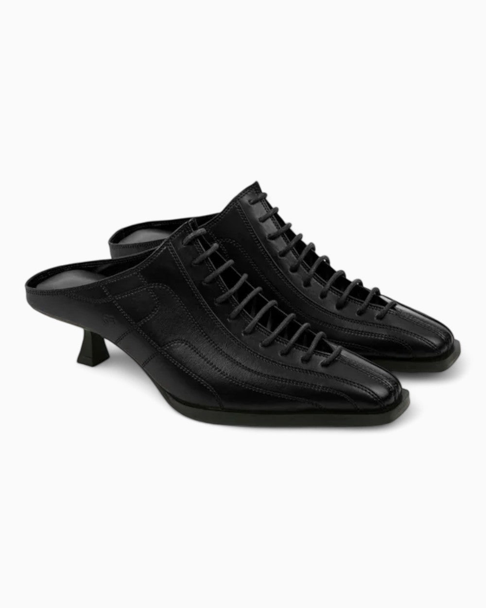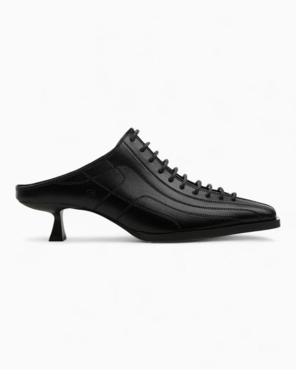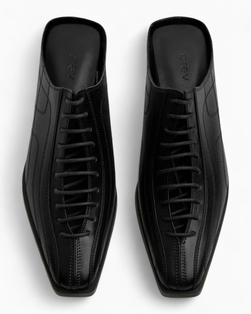 Cesur, zarif ve güçlü bir duruşu bir arada sunan bu model, köşeli taban yapısı, uzun burun formu ve özel dikiş detaylarıyla dikkat çeker. Baştan sona uzanan yüksek kaliteli pamuk bağcıkları ve geometrik çizgiler, Prev’in “narin ama güçlü” tasarım yaklaşımını yansıtır.