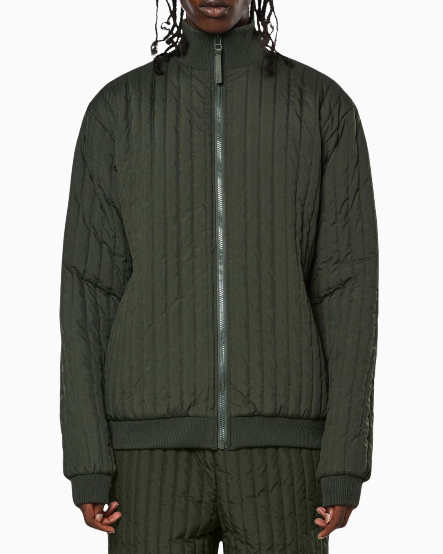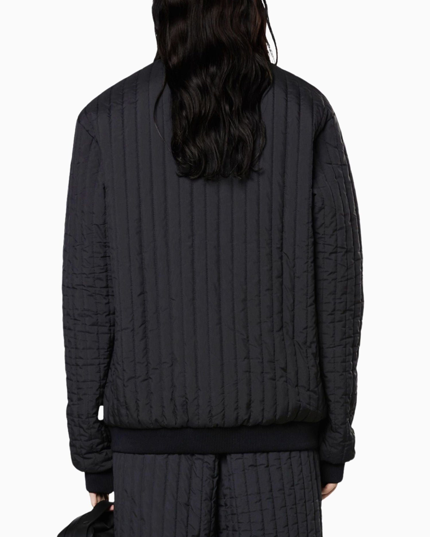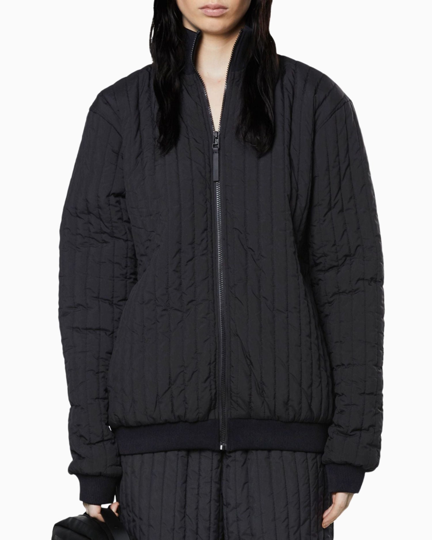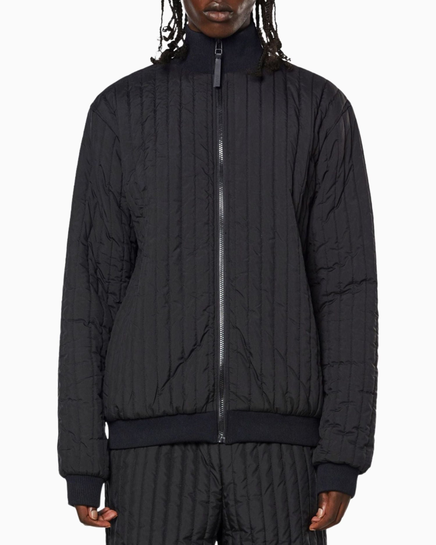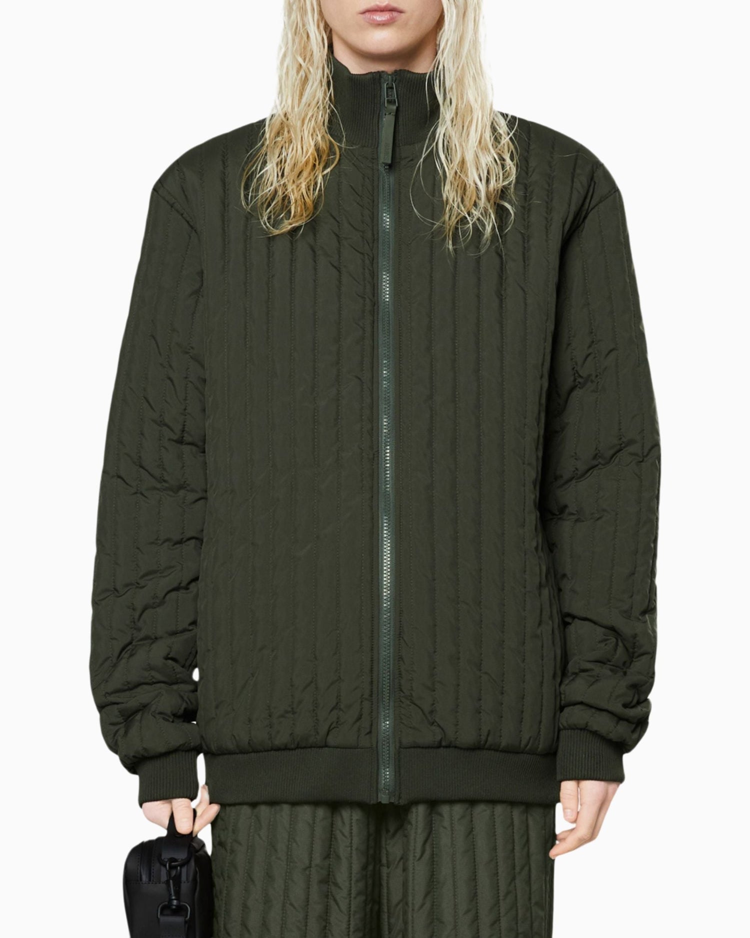Liner High Neck Jacket, dış giyimin altına veya hafif bir üst katman olarak giyilmek üzere tasarlanmış çok yönlü bir geçiş parçasıdır. Su geçirmez olmayan kapitone ceket, yüksek nervürlü yakası ve kontrast oluşturan fermuarlı kapamasıyla karakterize edilir. Parça, arkaya monte edilmiş bir TPU kayışla Rains' Essential dış giyim koleksiyonundaki tasarımlara takılabilir.