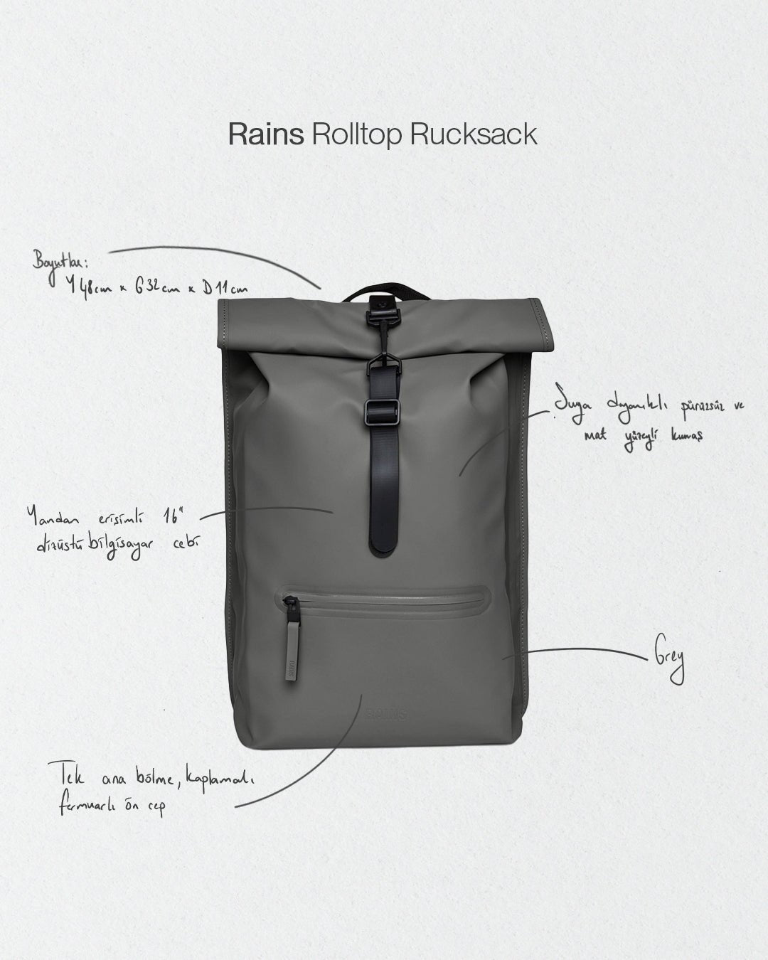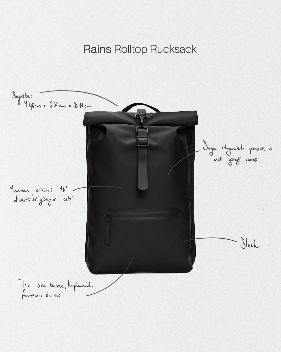 Rolltop Rucksack, bisiklette kullanılması için bisiklet kilitlerini tutması ideal olan bir ön D halkası ve güvenli bir sürüşe dayanıklı uyum için tokalı bir göğüs kemeri ile tasarlanmıştır. Rains'in su geçirmez PU materyalinden üretilmiştir.
