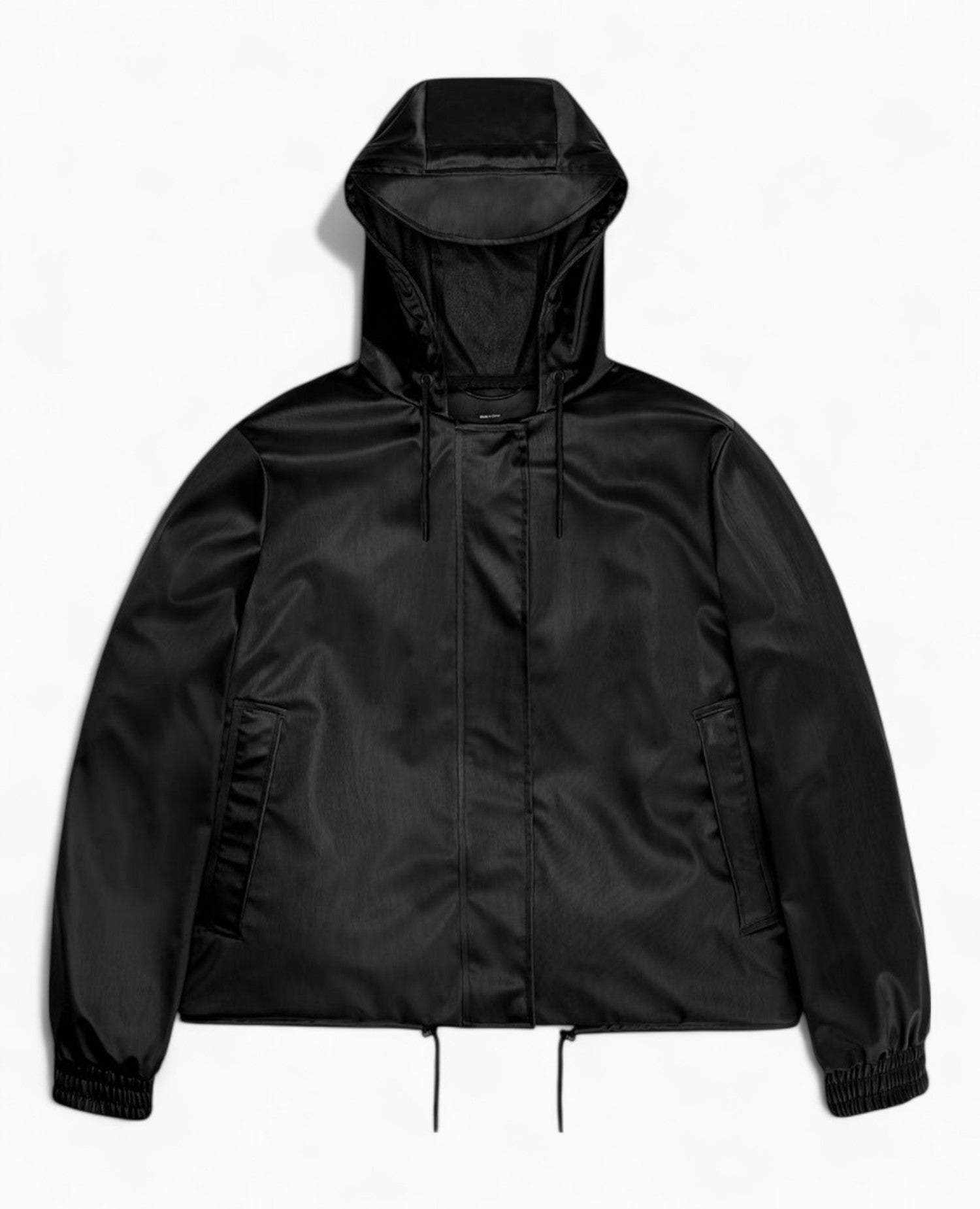 Rains'in ikonikleşen, suya dayanıklı, yumuşak, pürüzsüz kumaşından üretilen String W Jacket, çift kaynaklı dikişlere sahiptir. Tasarımda elastik manşetler, eğimli ön cepler ve havalandırma için koltuk altı delikleri bulunur. Silüet, büzme ipli etek kısmı sayesinde değiştirilebilirken, çıtçıtlı patlet ve imza niteliğindeki siperlikli kapüşon görünümü tamamlanmaktadır.