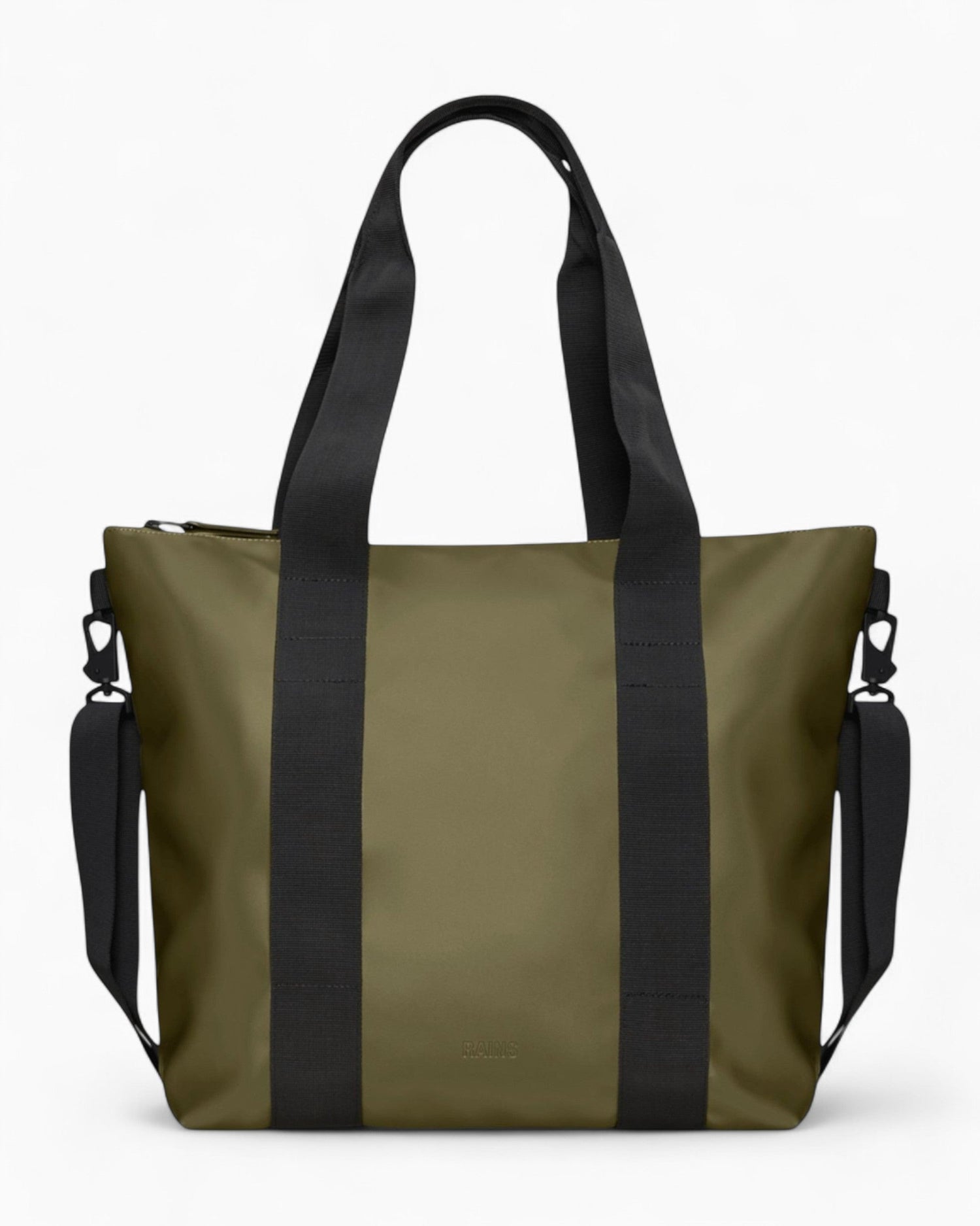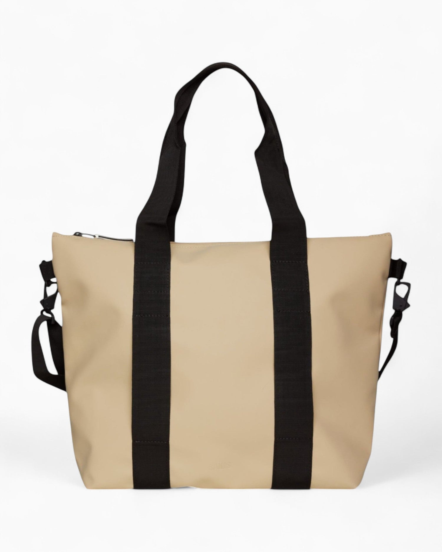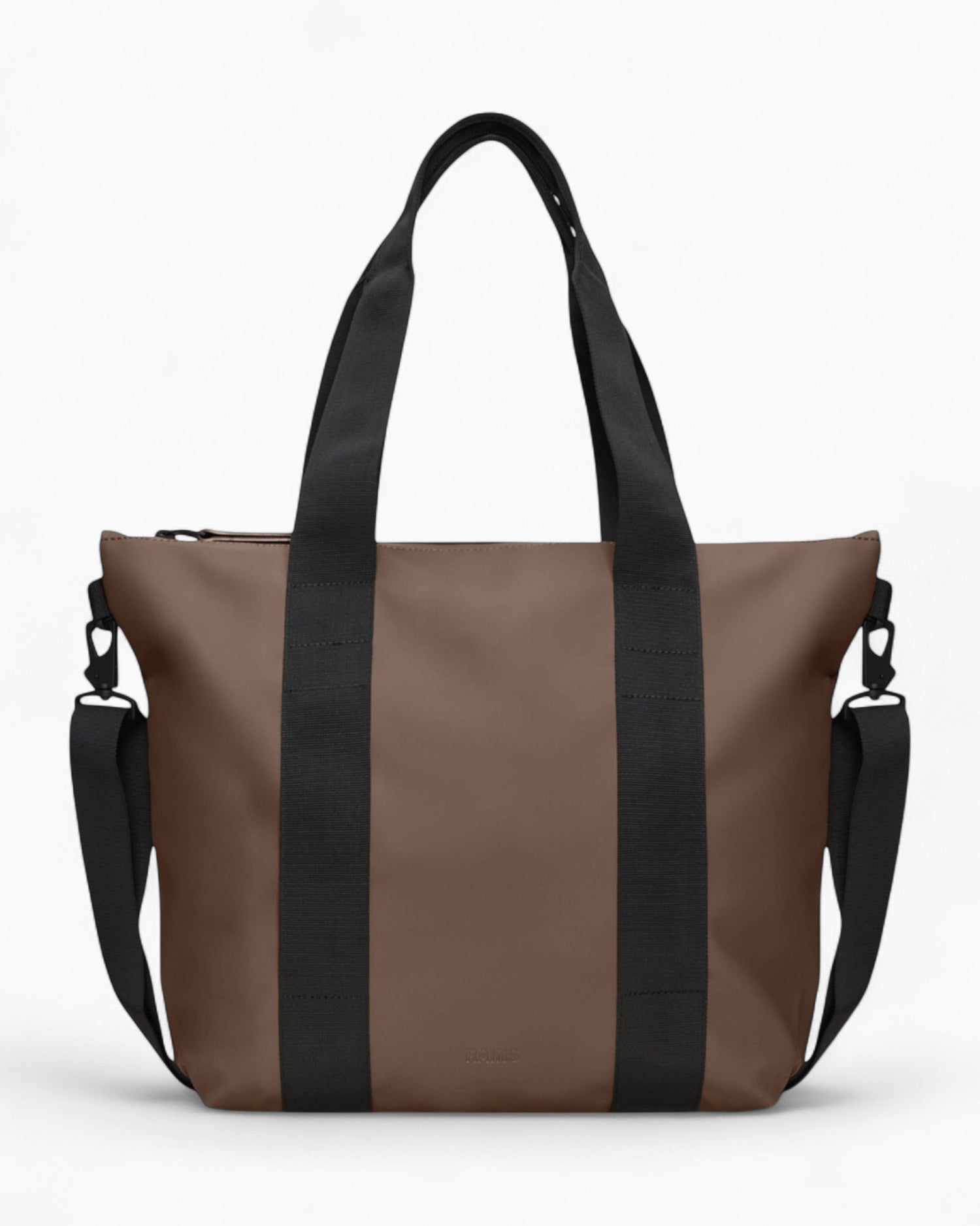Totebag Mini, Rains klasiği Totebag'in küçültülmüş bir versiyonudur. Rains'in özel su geçirmez kumaşından üretilen tasarım, her türlü hava koşulunda kullanımı kolay bir temel sunar. Kaplamalı bir fermuar, altından saran dokuma kulplar ve çıkarılabilir omuz askısı ile tamamlanmıştır.