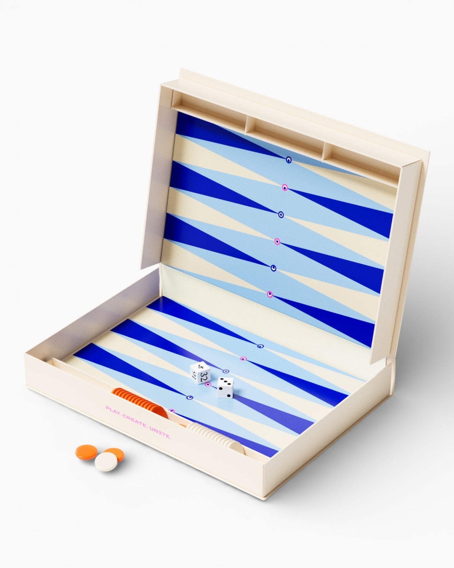 Kitap gibi açılan kutu tasarımı, iç yüzeydeki parlak akrilik oyun alanı ile buluşur. Özel üretim zarlar ve pürüzsüz akrilik pullar, hem dokunuşta hem kullanımda premium bir his sunar. Hafif ama sağlam yapısı sayesinde kolayca taşınabilir; sergilendiği her ortamda minimal ama güçlü bir duruş sergiler.