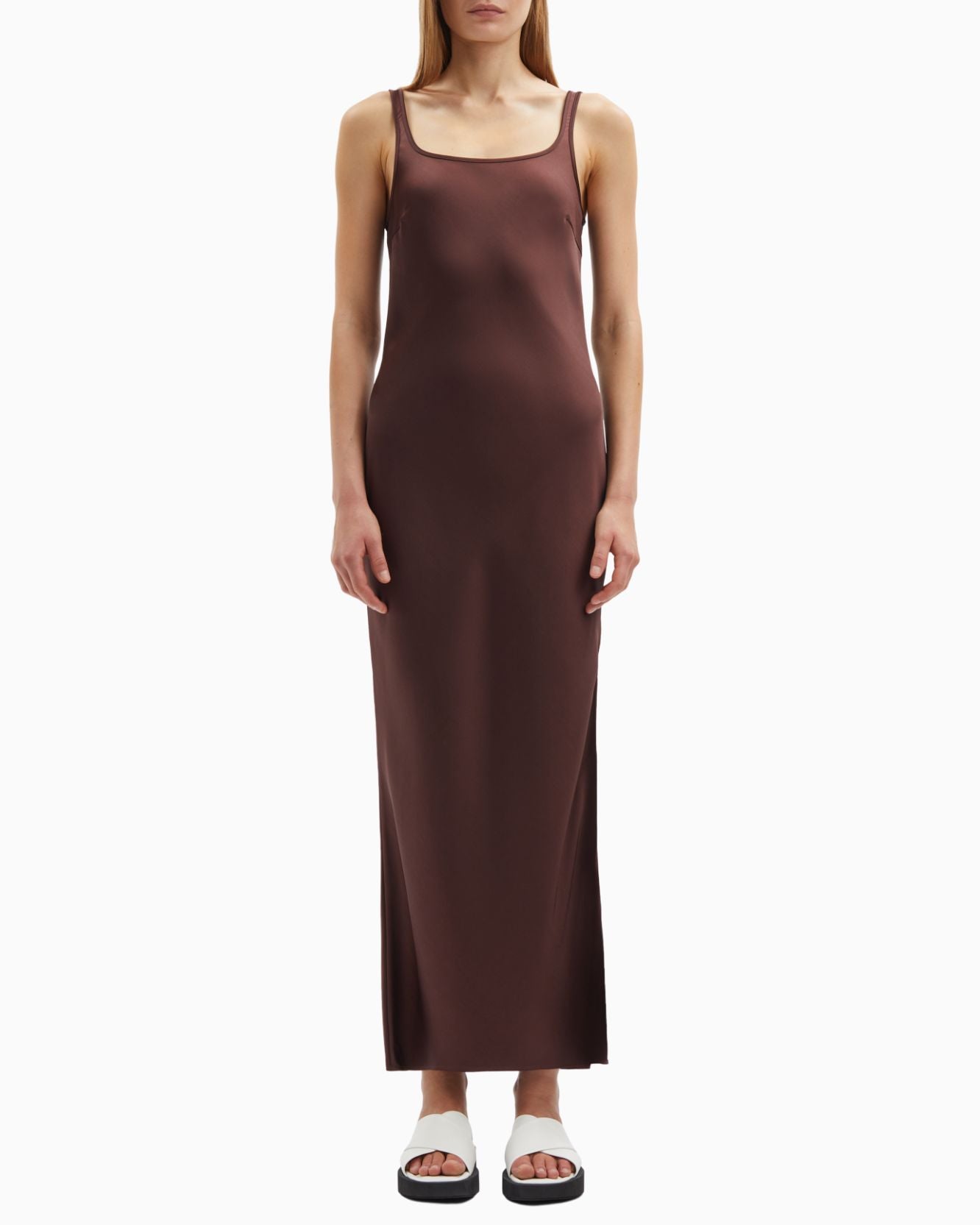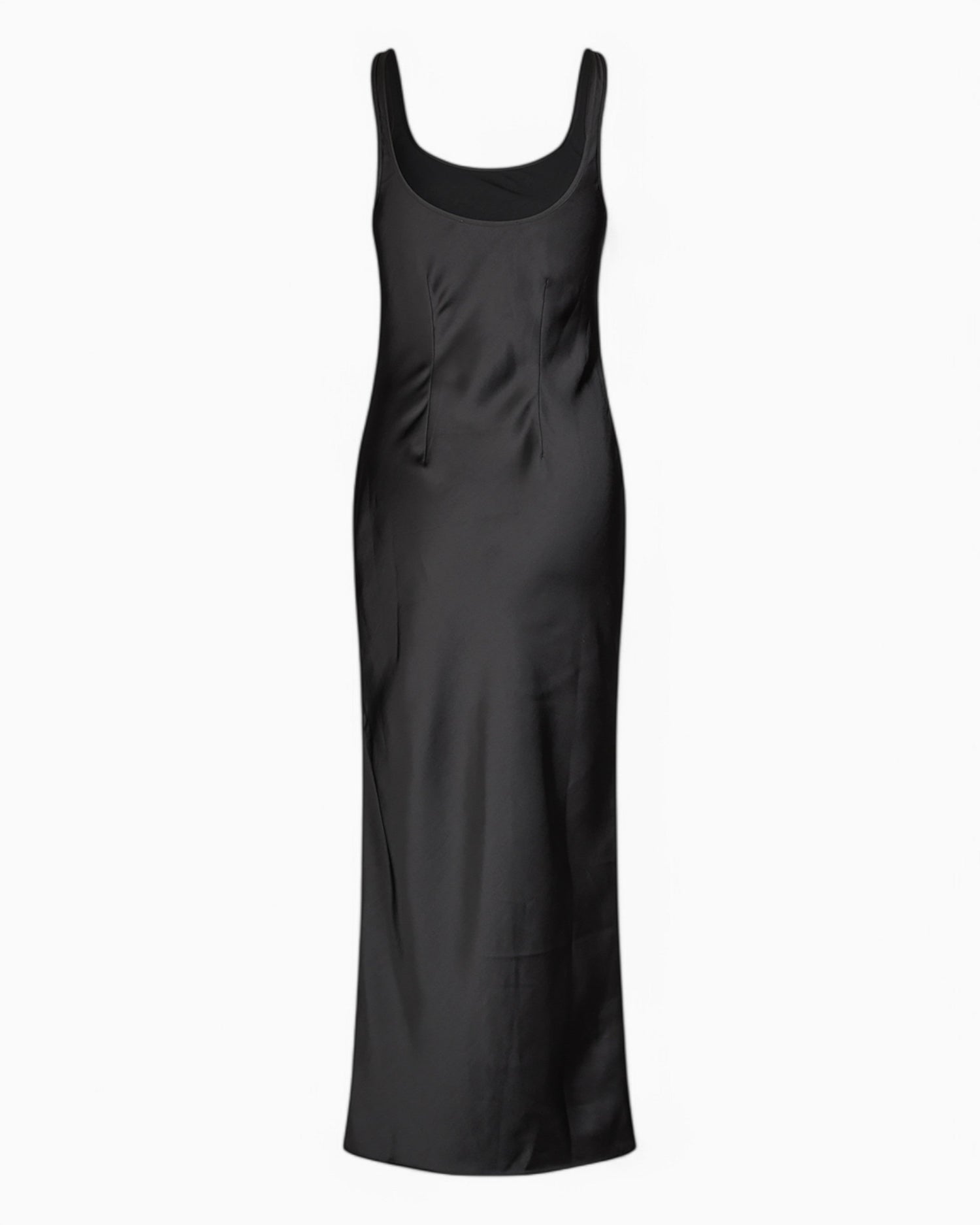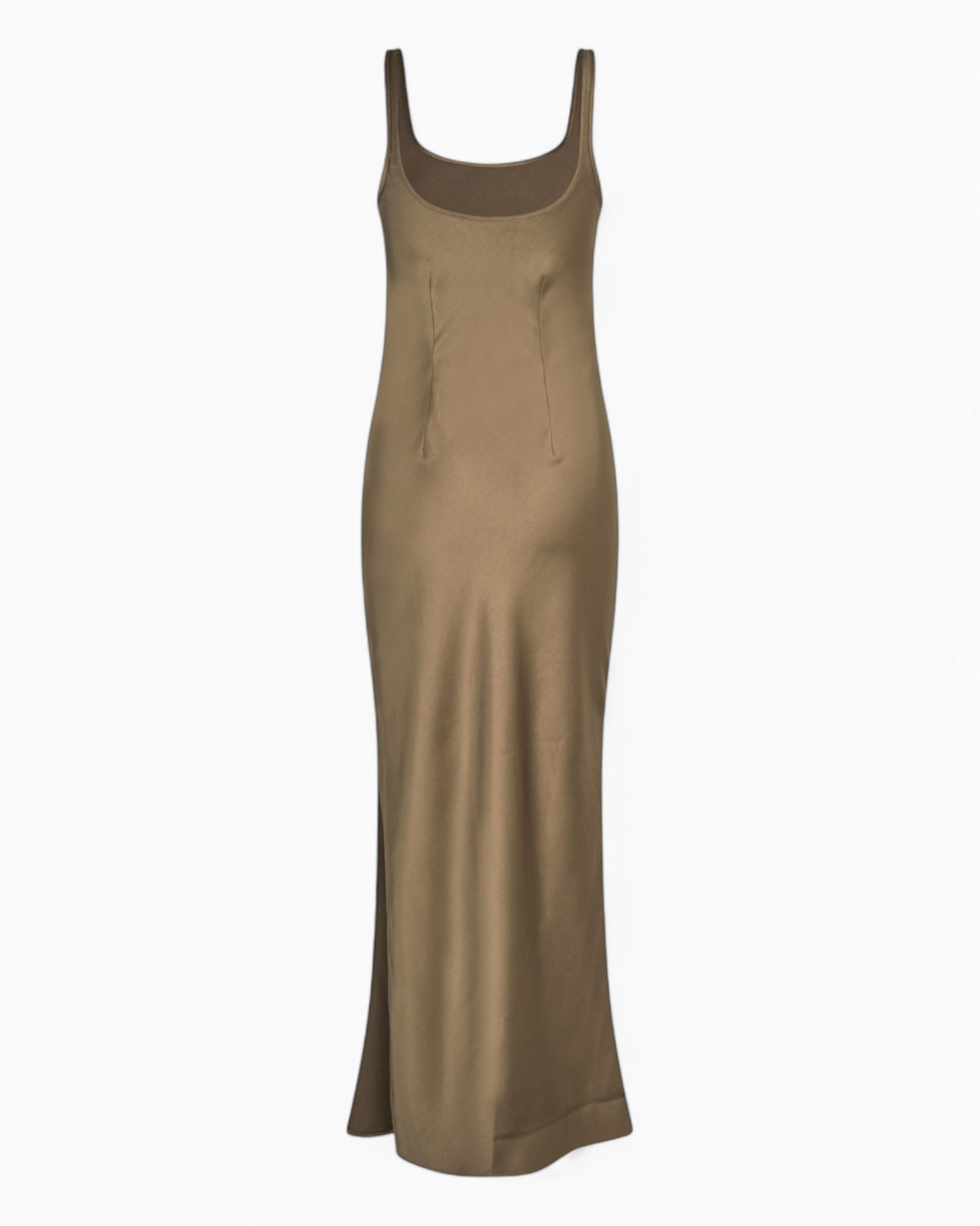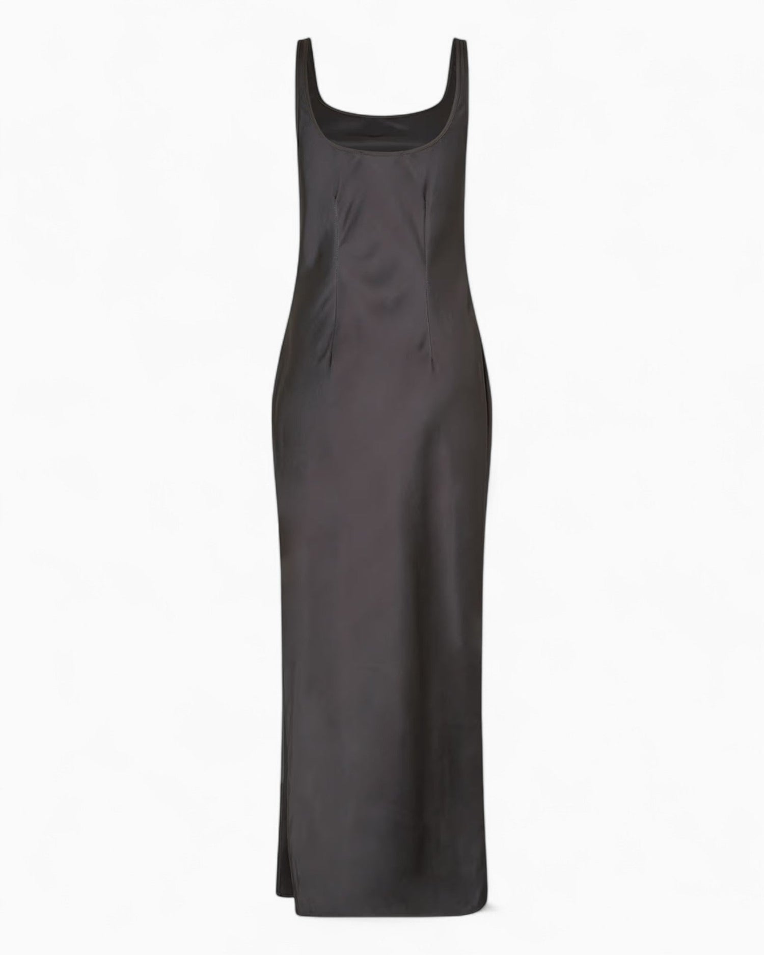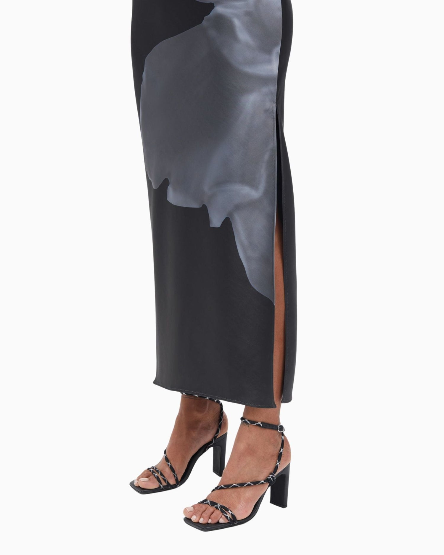Yan yırtmaçlı, dar kesimli, çapraz kesim saten maksi elbise, %100 geri dönüştürülmüş polyesterden üretilmiştir. Bu ürün GRS sertifikalıdır ve tedarik zincirinin her aşaması katı sosyal, çevresel ve kimyasal gereklilikleri karşılamaktadır.